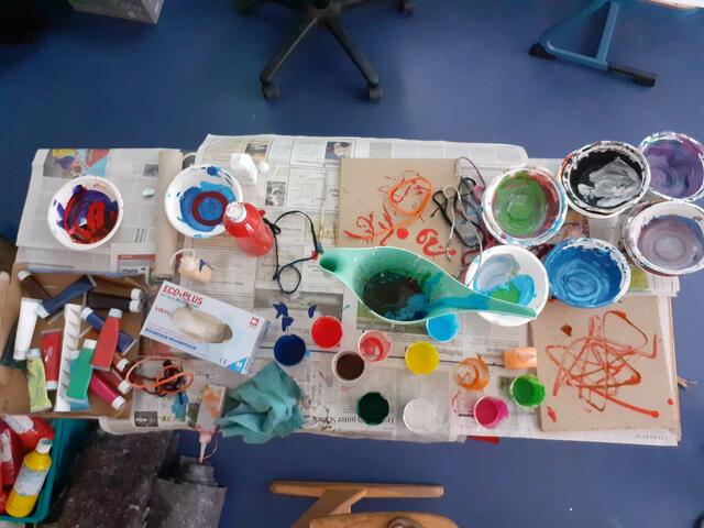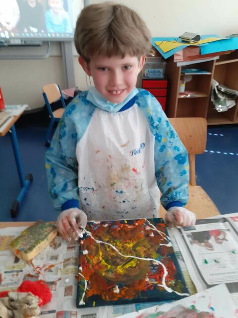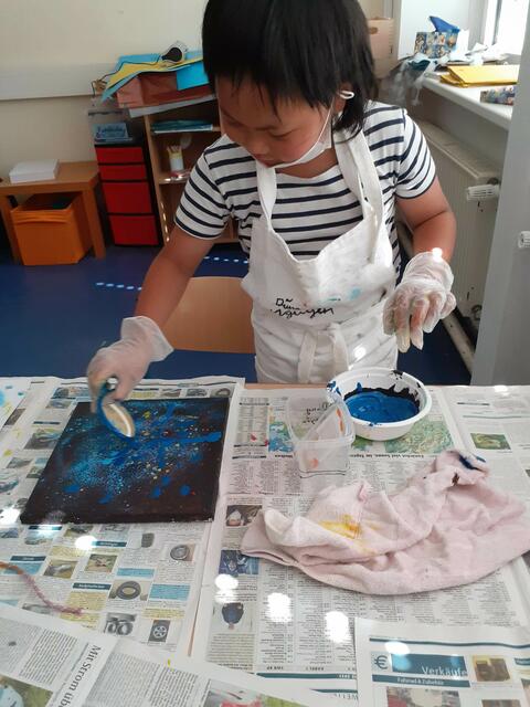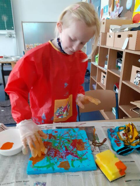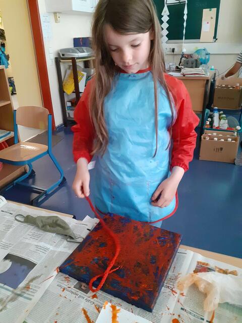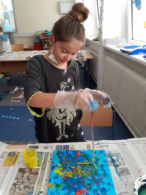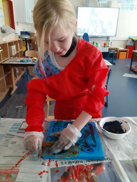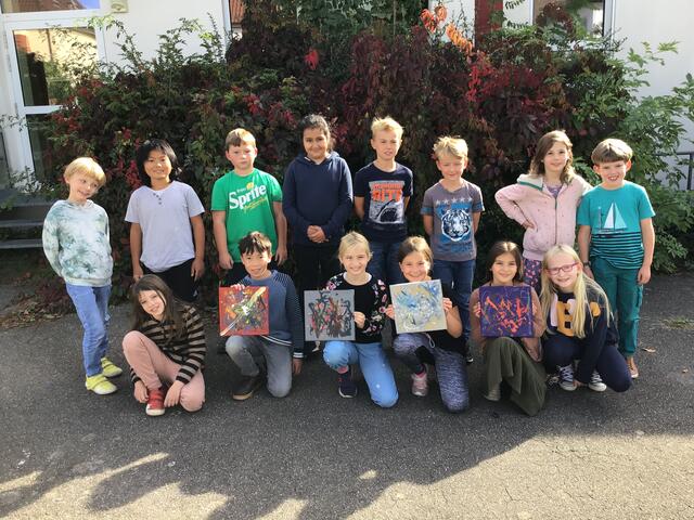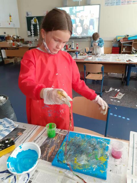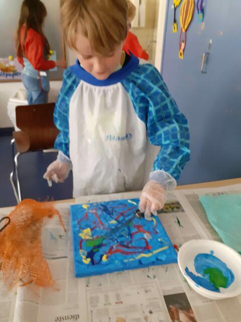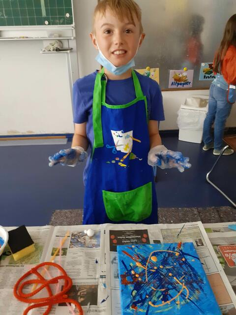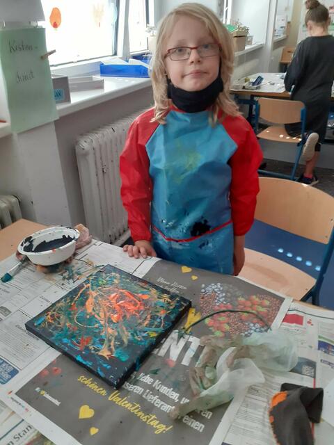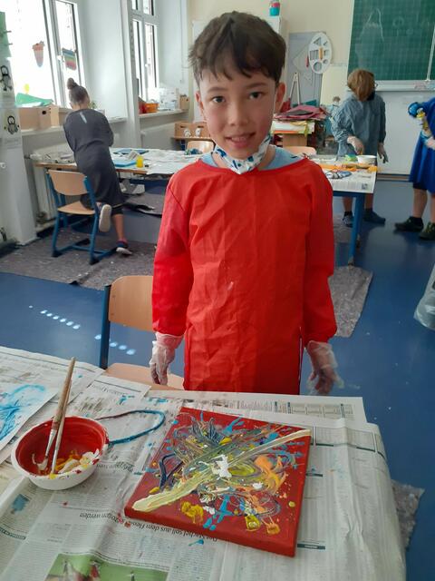 Nach mehreren Runden der Diskussion im Klassenrat entschieden sich die Schüler*innen dann tatsächlich, ein Bild zu gestalten, das sie für einen guten Zweck verkaufen würden. Nun hieß es aber zuerst, zu überlegen, welche Art Kunstwerk Erwachsene kaufen würden. Per Zufall entdeckten die Kinder in dieser Zeit dann Jackson Pollock und das Action Painting. Diese Art der Malerei sprach die Kinder sehr an und sie waren sich sicher, dass ihre Ergebnisse schön genug werden würden, um sie verkaufen zu können. Jetzt galt es, das passende Material für das neue Projekt zu besorgen. Eine Schülerin der Klasse erzählte von ihrem Vater, der über seinen Beruf leicht an Holz käme. Kaum war die Idee zu Ende gedacht, hatte diese Schülerin auch schon alles organisiert und es landeten viele quadratische Pressholzplatten in der Schule, die dann in mehreren Arbeitsschritten bearbeitet wurden. Zuerst wurde die Platte versiegelt, dann weiß grundiert. Danach wurde ein Hintergrund aus 3 Farben geschaffen. Und dann ging es richtig los: mit Fingern, Schnüren, Farbtuben, Spritzen und vielen anderen Hilfsmitteln brachten die Schüler*innen bunte Farbe auf den Untergrund. Und so entstanden nach vielem Ausprobieren 14 Kunstwerke, die sich auch im Schaufenster einer Galerie gut gemacht hätten. Doch bis dorthin sollten die Bilder gar nicht erst gelangen. Denn die Beziehung der Kinder zu ihren Kunstwerken war so groß geworden, dass die Idee, die Bilder einer breiteren Öffentlichkeit zugänglich zu machen, verworfen wurde. Um das Kunstwerk in ihrer Nähe zu behalten, sprachen die Kinder mit ihren Eltern und Großeltern und verkauften die Bilder in die eigene Familie. Manche Kinder stockten den Kaufpreis noch mit ihrem Taschengeld auf. So kamen erstaunliche 370€ zusammen, mit denen die Schüler*innen nun 370 Bäume für Bennis Regenwald kaufen konnten. Bennis Regenwaldprojekt befindet sich in Indonesien. Insgesamt möchte er 100 000€ für neue Bäume sammeln. Die Klasse 3a ist mächtig stolz auf ihren Beitrag zu Bennis Projekt.