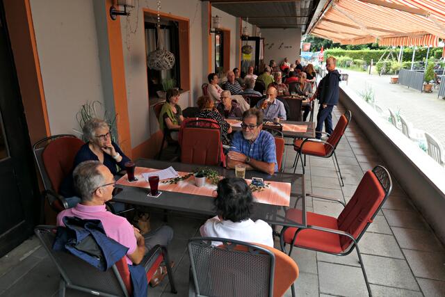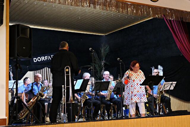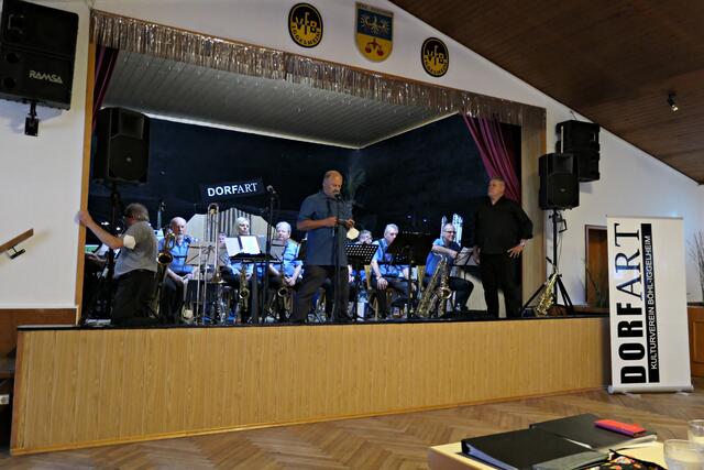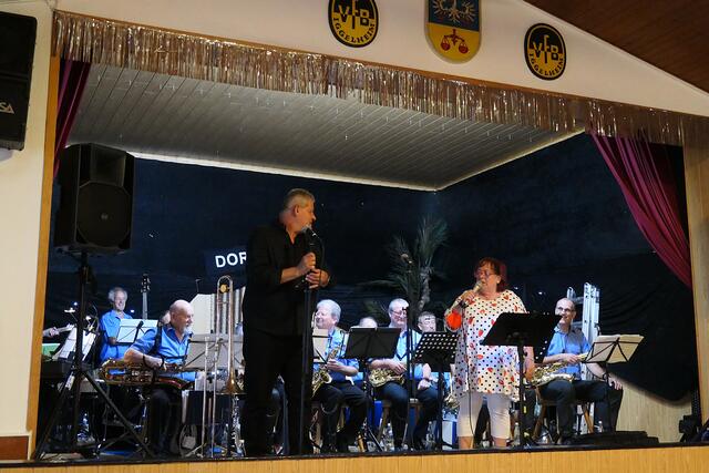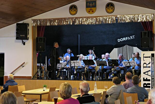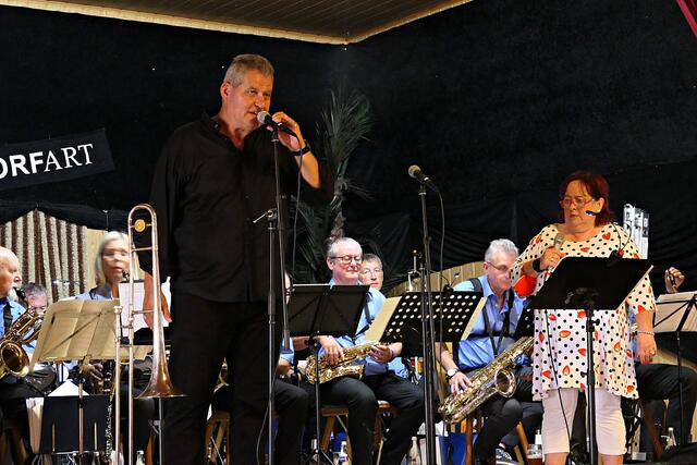 Böhl-Iggelheim. Am Sonntag, dem 22. August lud der Kulturverein DortArt e. V. nach vielen Ruhemonaten erstmals wieder zu einer Veranstaltung ein. Auf dem Programm stand die TC Big-Band mit einigen Solisten unter der Leitung von Paul L. Schütt aus Haßloch beim VfB Iggelheim. Eigentlich sollte die Veranstaltung im Freien stattfinden, musste jedoch aus wettertechnischen Gründen kurzerhand in den Innenbereich verlegt werden. Dennoch ließen es sich viele nicht nehmen, draußen auf der überdachten Terrasse den Klängen zu lauschen. Dadurch hatte man im Innenbereich genug Platz und alle Fenster waren geöffnet, so dass man sich nicht zu sehr auf der Pelle saß. Lediglich die 20-köpfige Band hatte etwas an Abstand verloren, ging aber gerade noch.