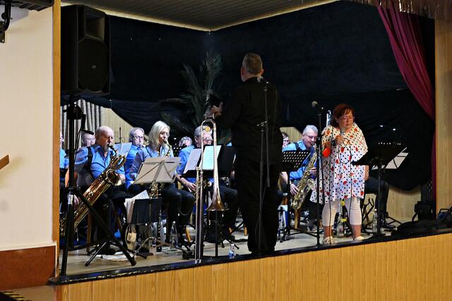 Hellhörig wurde man neben den einzelnen instrumentalen Solisten (Posaune, Saxophon, E-Gitarre, Trompete) besonders bei der Sängerin Angelika Rothert, deren Herz für Jazz und Swing schlägt und mit ihrer souligen Stimme Gänsehautmomente zauberte. Sie betrat immer wieder zwischendurch die Bühne. Besonders gefiel mir der wundervoll vorgetragene Song „Summertime“ von Georg Gershwin. Nach 45 Minuten hatten sich alle eine Pause zum Auftanken verdient. Rothert meinte „Die Gewerkschaft sitzt uns im Nacken und wir müssen nun eine kleine Pause machen.“