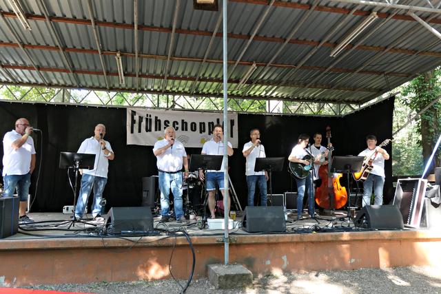 Nach dem Soundcheck durch Marco Hartmann ergriff Kurt Hauck (Kutte) das Mikrofon, um sich bei den Zuschauern für ihr Kommen zu bedanken und zum Ausdruck zu bringen, dass man sich gerne mehr Publikum gewünscht hätte. Man saß im Mindestabstand, war an der frischen Luft und hatte auch noch gute Unterhaltung, was will man mehr? Ully Zahn wurde gedankt, dass er es ermöglicht hatte, dass sie auftreten konnten. Alle Musiker hatten ihr einheitlich gestaltetes Frühschoppler-Shirt an.