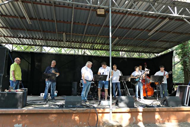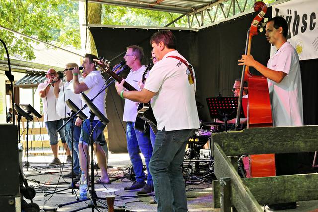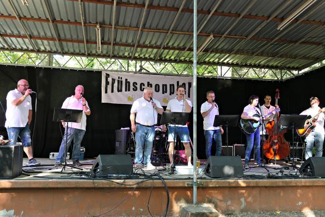 Böhl-Iggelheim. Am letzten Wochenende war ganz schön was los am Naturfreundehaus in Iggelheim am „Igg‘lemer Haisl“. Den Beginn machte am Freitag, den 11.09., „Mr. Pälzer Schorle“ mit Elektrosound, samstags folgte die Band „Jo’s Mum“ mit Funk-/Rock-/Soul-Klassikern bis hin zu aktuellen Chartpositionen und am 13.09. ließen es „Die Frühschoppler“ krachen. Bei deren Auftritt zum Frühschoppen ab 11.00 Uhr war ich als Zuschauer vor Ort. Der Veranstalter „Igg’lemer Haisl“ hatte alles „Corona zu liebe“ mit Flatterbändern abgegrenzt, Einbahnstraßen geschaffen und die Tische weit genug auseinander gestellt. Die herrlichen Temperaturen luden unter den schattigen Bäumen vor der Bühne zum Verweilen ein. Und so standen dann neun Musiker in den Startlöchern, die endlich wieder ihre Musikalität unter Beweis stellen konnten, unterstützt durch die Instrumente wie Kontrabass, zwei Gitarren und einem Schlagzeug.