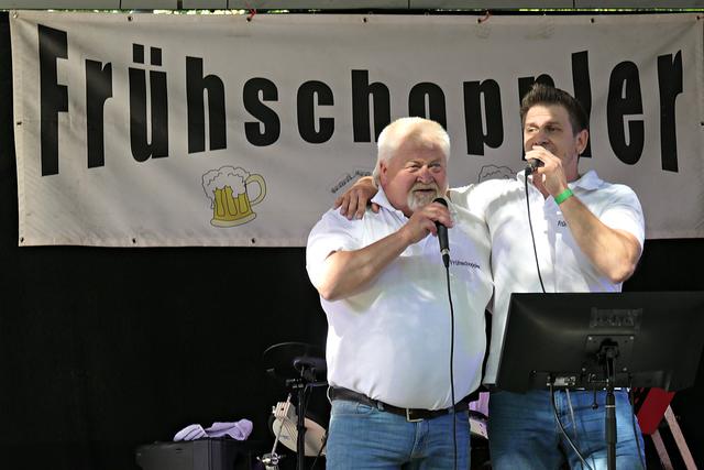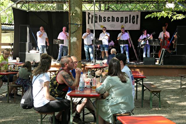„Die Frühschoppler“ setzen sich normalerweise zusammen aus: Udo Külbs, Michael Müller, Michael Mildenberger, Kurt Hauck, Gerd Theobald, Monika Mildenberger, Beate Seyfarth, Peter Kokl, Dieter Trippen, Matthias Linder, Marco Hartmann und Kai Büttner, heute in leicht reduzierter Ausgabe.