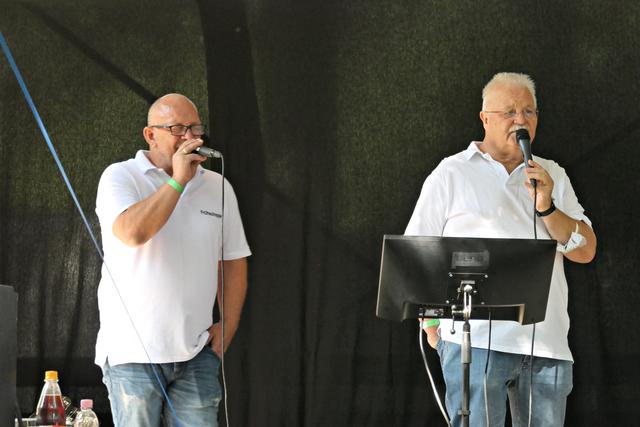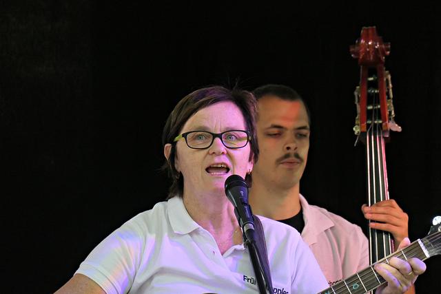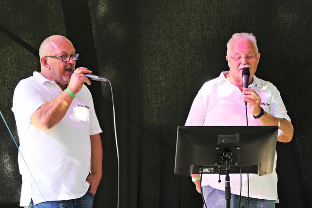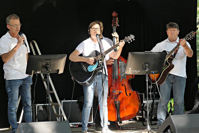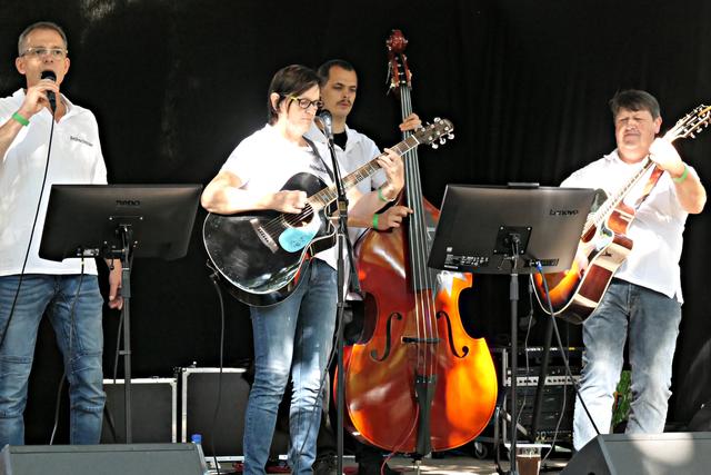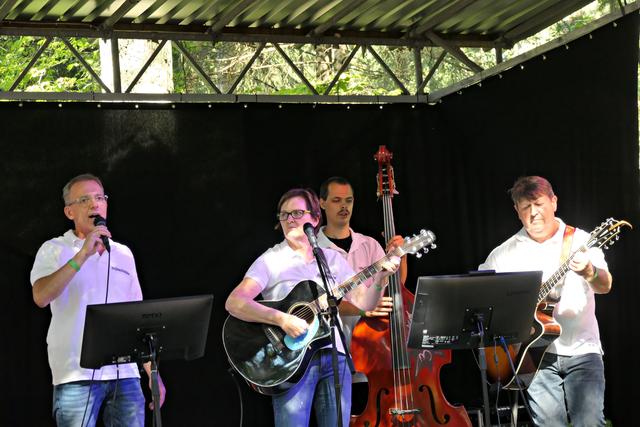 Den Auftakt des Gesangs-Feuerwerks machte natürlich das Lied „Ich bin wieder hier“, jawoll. Es folgte das flotte Lied „Verdammt ich lieb dich“ und „Ein Bett im Kornfeld“. Es sollte ein vielfältiges Programm werden von ganz alten bis ganz neuen und eigenen Texten. Auch die Eltern und Kinder auf dem benachbarten Spielplatz lauschten fasziniert den Klängen und es war „Alles umme“. „Ich war noch niemals in New York“, „Eine neue Liebe ist wie ein neues Leben“, „Hello Mary Lou“ und das umgedichtete Lied „Ja als echter Pälzer (In de Palz is es schä)“, einer Hymne auf die Pfalz. „Wer’s glabt werd seelig“ hatte die einzige weibliche Verstärkung Moni komponiert und getextet. Bis mittags kamen dann immer mehr Zuschauer und die Stimmung stieg, Mitklatschen und Applaus wechselten sich ab. Es folgte ein rockiges Lied, das an die Elvis-Zeit erinnerte mit Rock’n’Roll und Hüftschwung. Dann ging es in die wohlverdiente Pause.