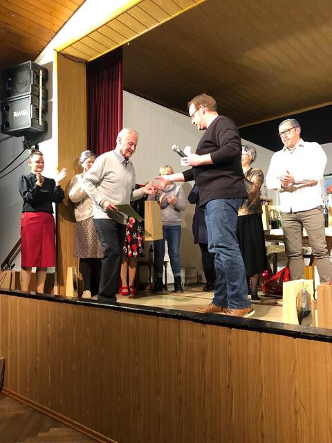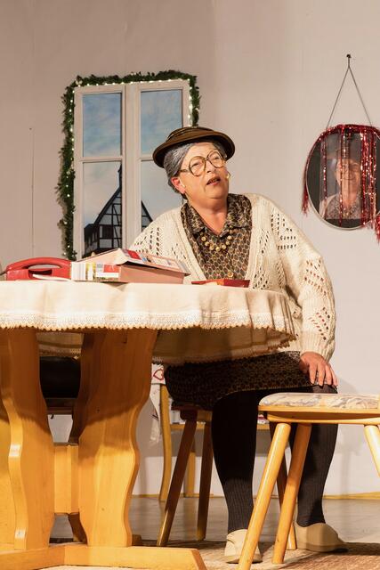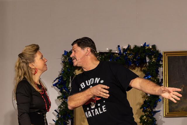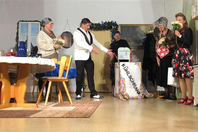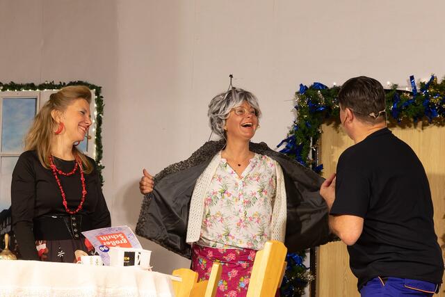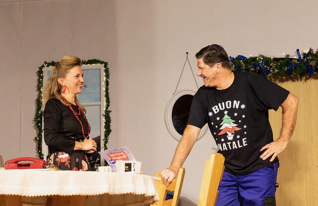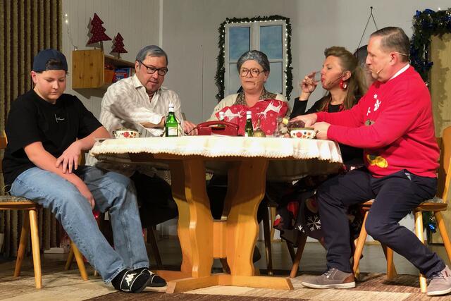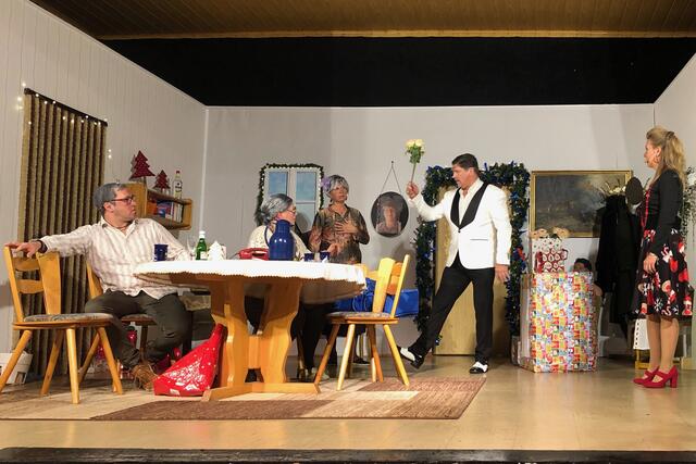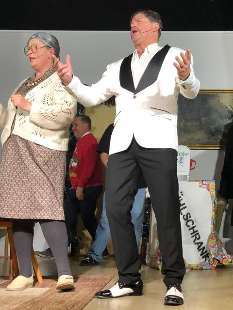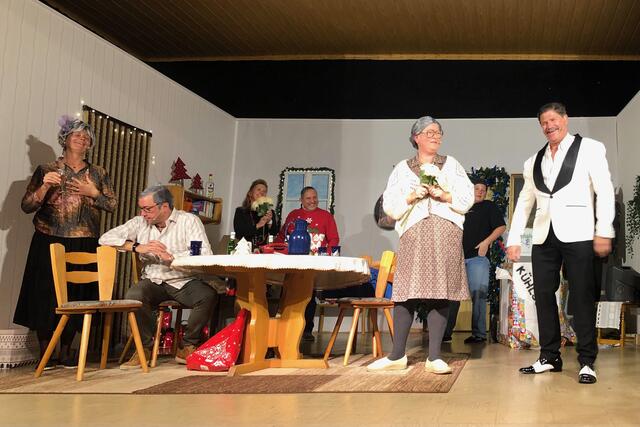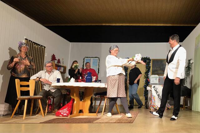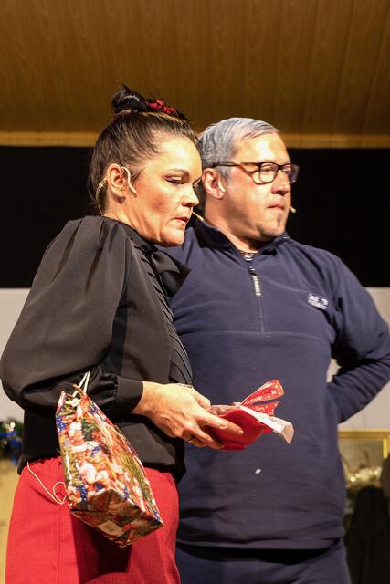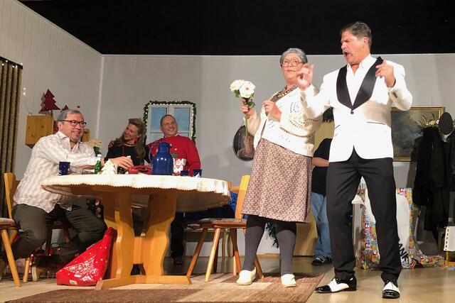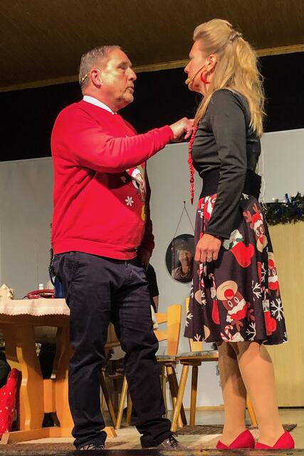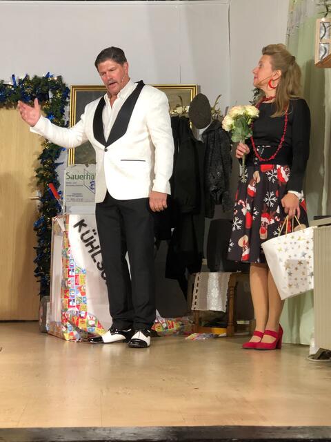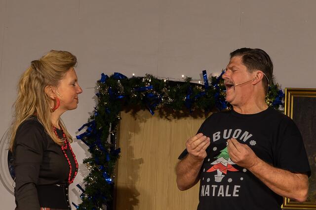 Weiter ging es im letzten Akt als alle fein angezogen auf den Heiligen Abend „zuschritten“. Aber zuvor mussten sich die jungen Eheleute aussprechen, denn Knatsch am Weihnachtsabend kam nicht in die Tüte. Es gab bereits vor dem Essen Schnaps für die Herren und Pikkolo für die Damen (da Bier war eingefroren), damit man endlich in Weihnachtsstimmung komme. Die Bescherung fand nach dem Essen statt; da gab es dann die beschichtete Bratpfanne für Irmgard, das SOS-Geschenk für Reinhold (Schlips, Oberhemd, Socken), Angelika wurde mit einem Toaster von ihrem Mann beschenkt und der wiederum bekam eine Krawattennadel. Die Oma schnupperte am ranzigen Parfum „Lavendel uralt“, da wäre ihr Tosca oder 4711 lieber gewesen. Es blieb nicht lange still, da zoffte sich jeder mit jedem. Da ging die Tür auf und herein spazierte Luigi mit jeder Menge Geschenke und dem versprochenen Kühlschrank. Dann hatte er seinen großen Auftritt mit dem Lied „Santa Lucia“, welches er mit der Oma schmetterte. Nach nicht enden wollendem Beifallsklatschen musste er sogar noch eine Zugabe geben.