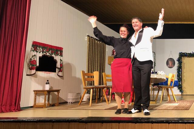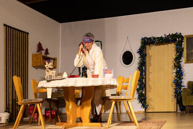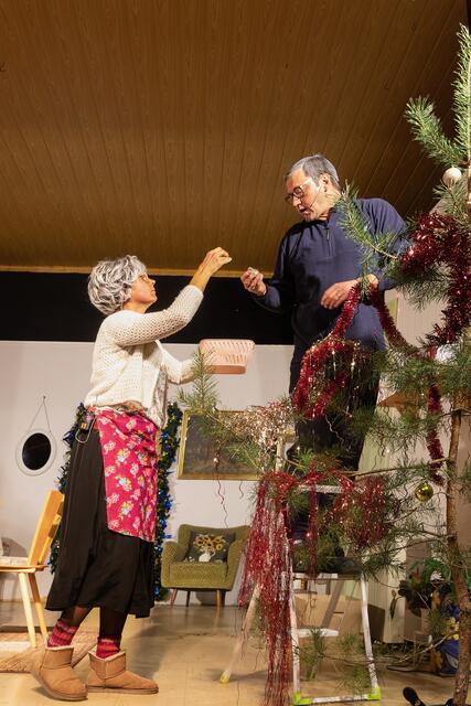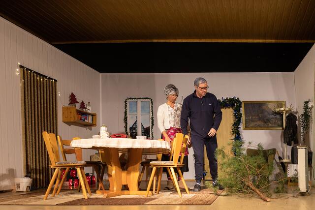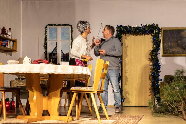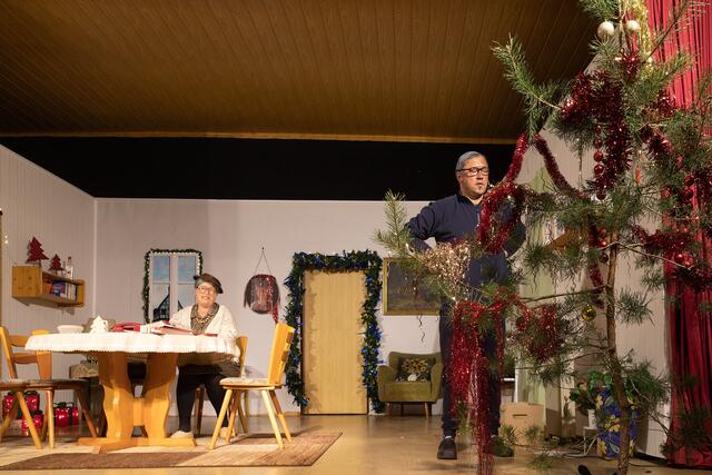 Kurzer Umbau. Die neugierige Nachbarin Frau Mauschler erschien und wollte sich ein Ei ausleihen. Da schneite Reinhold Eislein in den Raum, bepackt mit einem Christbaum wie ich ihn noch nie zuvor gesehen habe. Das Publikum beömmelte sich vor Lachen. Halb nackte Zweige und Nadeln, etwas schief und alles andere als ein optisches Highlight. Aber nun gut, da war ja noch die Sache mit dem Lametta. Gemeinsam pfefferte das Paar eher lieblos das Lametta auf die Äste, so dass es zum Schießen aussah. Der Sohn kam in der Zwischenzeit vom Einkauf zurück und hatte eine frische Gans dabei und eine Gänsekeule. Und davon soll die Familie satt werden? Die Gans war nur halb so groß wie die erste und hatte eher die Form eines Hähnchens. Es herrschte ein Kommen und Gehen im Haus und auch der Schwiegersohn Eberhard traf ein und suchte seine Geli-Maus. Es klingelte und wer stand vor der Tür? Oma Klothilde wartete nicht auf Abholung um 17 Uhr, sondern nahm das Taxi. Papa Reinhold war mit dem Christbaum schmücken fertig und wollte sehen, ob er brennt. Und wie! Es machte Puff und Rauch stieg auf, natürlich nur künstlicher. Es folgte eine Pause, in der ordentlich durchgelüftet und für Getränken gesorgt wurde. Das ging trotz langer Warteschlange recht fix an der Bar, zack-zack. In der Pause unterhielt ich mich mit Jule Holtkamp und Freund Tobias. Jule plauderte aus dem Nähkästchen, dass das Stück wie auf die Eltern zugeschnitten sei.