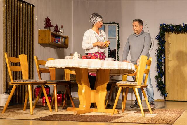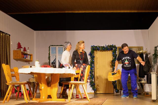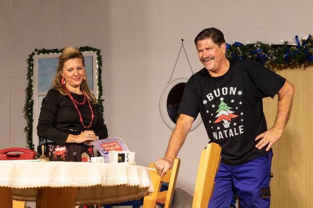 Vorhang auf! Irmgard telefonierte mit ihrer Schwiegermutter Klothilde, die ein bisschen schwerhörig und begriffsstutzig war, denn es blieb nicht bei dem einmaligen Anruf, nein, denn er folgte praktisch im 15-Minuten-Takt. In aller Herrgottsfrüh funktionierte die Heizung nicht, es war bitter kalt im Wohnzimmer, deshalb musste Luigi schnellstmöglich kommen, denn es war Heilig Abend und das Fest wollte man gemütlich im Kreise der Familie begehen. Aber auch der Kühlschrank war defekt und die Küche stand unter Wasser „Do hinn is alles Schrott“. Die gekaufte große Gans, die heute zubereitet werden sollte, begann bestialisch zu stinken. Was nun? Es musste eine neue her, was zu Reibereien zwischen den Eheleuten führte, ist doch der Ehemann ein kleiner Geizkragen, der die Gans sogar noch essen würde. Es war noch kein Christbaum gekauft und Irmgard meinte zurecht, dass die Christbäume, die es am 24.12. noch zu kaufen gebe, eher aussehen wie eine Klobürste. Es war kein Lametta da. Der knickrige Hausherr meinte, dass man früher das Lametta auch immer gebügelt hatte bevor es erneut an den Baum kam. Klaus-Dieter erschien müde und motzig am Frühstückstisch und was bekam er von seinem Vater zu hören? „So lange Du die Füße unter meinen Tisch stellst ……“, tja, wer aus der älteren Generation kennt diese Androhung nicht? Die Geschenke waren noch nicht eingekauft. Das Auto verlor Öl und Reinhold Eisele wollte es ausgerechnet am Heiligen Abend mit seinem Sohn reparieren. Da hatte er aber seine widerspenstige Frau nicht auf dem Plan, die entschieden dagegen war. Tochter Angelika traf ein mit Kevin in der Tragetasche und verheultem Gesicht. Sie lasse sich scheiden, denn ihr Mann sei zu seiner Mutter gefahren und ein richtiges Muttersöhnchen. Aber da kommt Luigi gerade rechtzeitig und verguckt sich in sie als Seelentröster und bot sich sogar an, für das Fest einen Kühlschrank zu besorgen.
