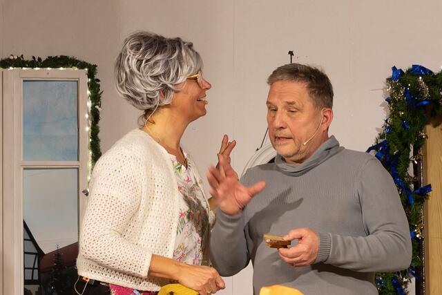 Am 9. Dezember gab es die Premiere, die vom Hörensagen bereits ein voller Erfolg war, und am 10. Dezember durften auch wir uns von der Unterhaltungsqualität des Ensembles überzeugen. Auf Pfälzisch wurde das von Monika Hirschle geschriebene Stück „Eine schöne Bescherung“ von Regisseur Norbert Stuck umgeschrieben. Eigentlich wollte er als Akteur mitspielen, musste aber krankheitsbedingt den Part an jemand anderes abgeben. Der „Heilige Abend“ sollte ja ein friedvolles Fest, ein Tag der Besinnung, Fest der Liebe sein, aber es kam alles ganz anders.