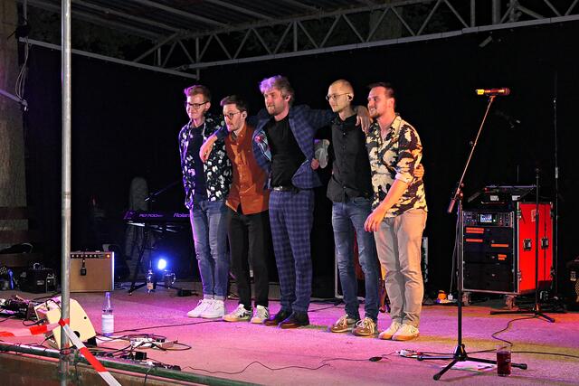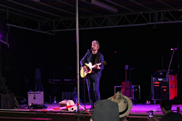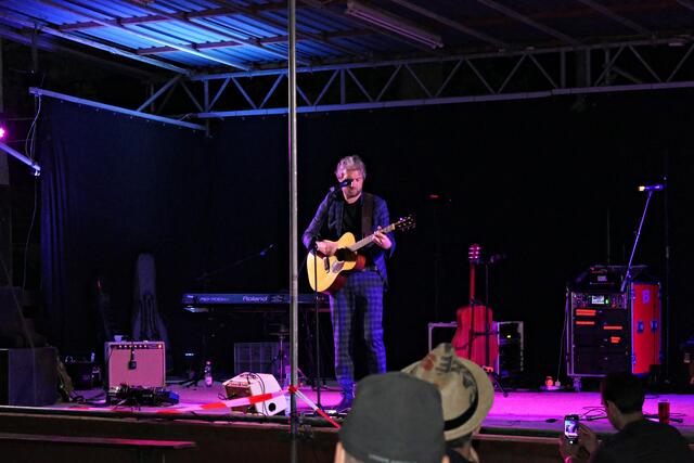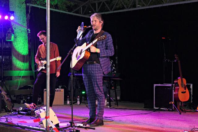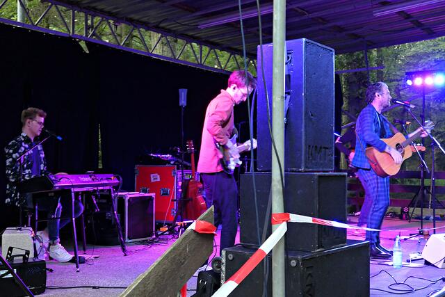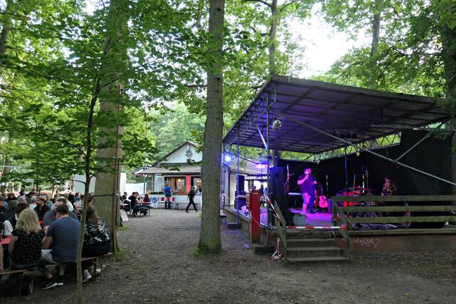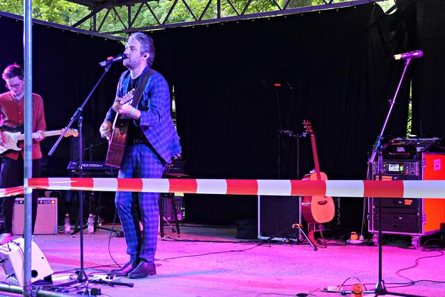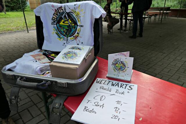 Der Vorplatz vor der Waldbühne - teilweise unterdacht – war sehr gut besucht. Kein Wunder, denn alle sind ausgehungert nach Live-Auftritten. Pünktlich um 20.00 Uhr betrat ein junger Mann mit Akustikgitarre als Support die Bühne, performte und heizte mit deutschen Texten ein. Sein Name? Singer und Songwriter Otto Ullmann aus Leipzig alias WELTWÄRTS MUSIK, allerdings heute ohne seine Band. Der Name wurde gewählt, weil viel und weit gereist. In seinen Texten spiegeln sich also Fernweh und Melancholie wieder. Autobiografische Songs führen einen an paradiesische Orte, an denen Otto als Straßenmusiker mit rauchiger Stimme und kreativem Sound seinen Unterhalt verdient hatte.
