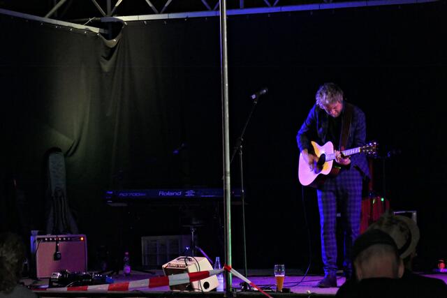 Veranstalter Ully Zahn bedankte sich anschließend und stellte den Hauptakt James Mackenzie mit Band vor. Dieser smarte Musiker betrat in kariertem blauem Anzug und mittlerweile ein wenig mehr ergraut unter kräftigem Applaus des Publikums um 21.00 Uhr die Stage. Er war vor ein paar Wochen schon einmal hier gewesen, woraus sich schließen lässt, dass er sich bei uns hier wohl fühlt. Er spielte teils Songs aus seinem letzten Album und hatte auch neue im Gepäck. Nach 45 Minuten erholten sich die Musiker in der angrenzenden „Freiluftgarderobe“. Zeit zum Getränke holen, denn auch die Whiskyfreunde Pfalz e.V. hatten hier einen Stand, der gut frequentiert wurde.