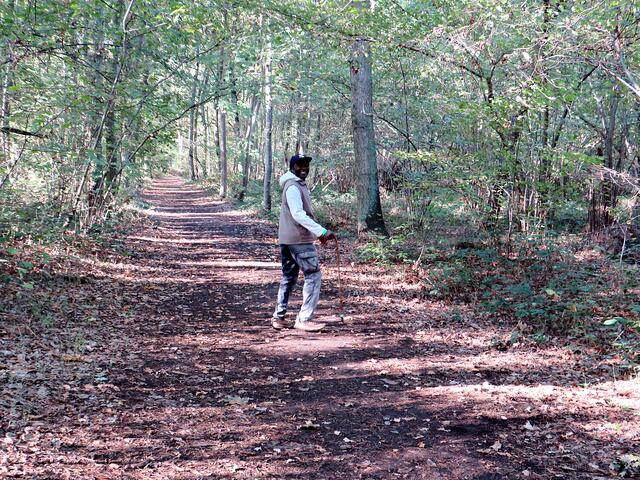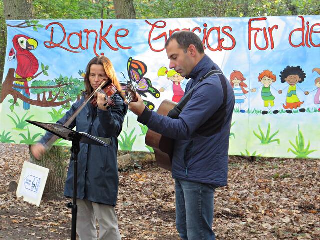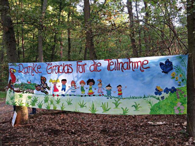 Wie jedes Jahr eröffneten und begleiteten die Musiker David und Alice Müller die Hungermarsch-Andacht. Vikarin Sarah Schulze zitierte ein paar Sätze von Apostel Paulus. Seit über 40 Jahren gibt es nun schon das Fest des Glaubens. Wir können und wir wollen helfen. Bernd Kiefer als Vorsitzender des Vereins Ökumenischer Hungermarsch Böhl-Iggelheim e.V. bedankte sich bei den Unterstützern und sendete einen besonderen Gruß an die Stiftung. Die kolumbianische Projektpartnerin Marisol begrüßte die Gäste mit „buenos dias“ und erzählte vom Aufbau einer Behindertenwerkstatt und plädierte für selbst bestimmtes Leben. Wir brauchen eine Perspektive! Ein von Kindern gemaltes Transparent mit dem Schriftzug „Danke Gracias für die Teilnahme“ hing zwischen den Bäumen. Es folgte noch ein kolumbianisches Lied und der Segen Gottes bevor zum Aufbruch gerufen wurde. Trotz hohen Alters mit dabei traf ich den 83-jährigen Heiner Huwe (Musikverein Iggelheim) mit Frau, die von Anfang an das Projekt „Hungermarsch“ unterstützen, jedoch nicht mitwanderten, und den 82-jährigen Herrn Winczy, der jedes Jahr mit seinen Wanderstöcken mit von der Partie ist.