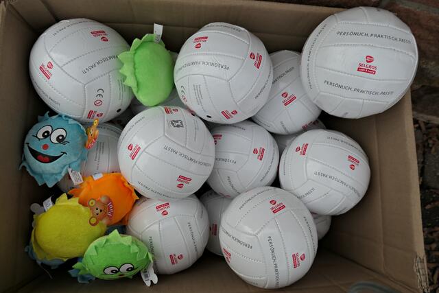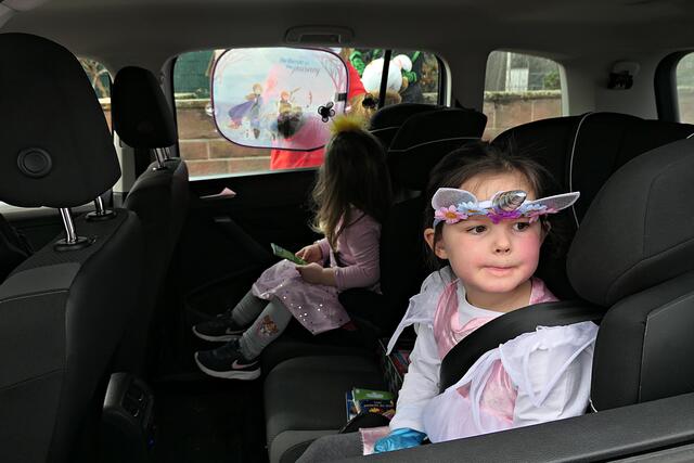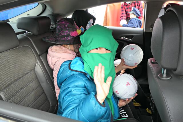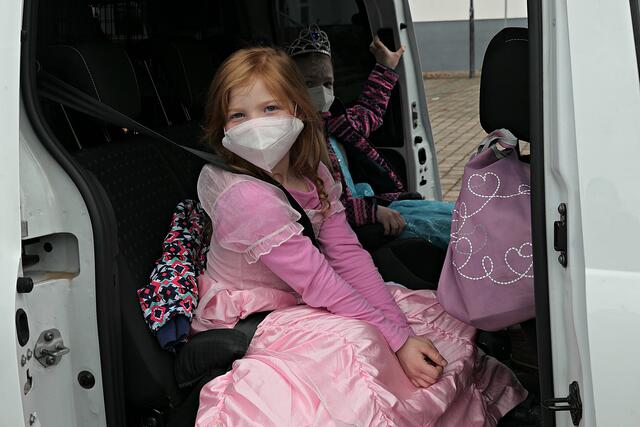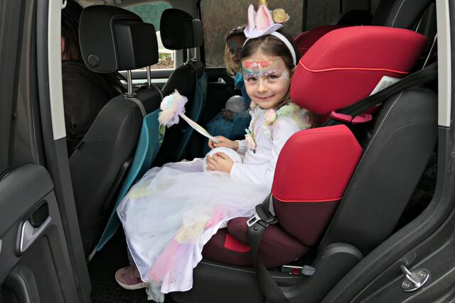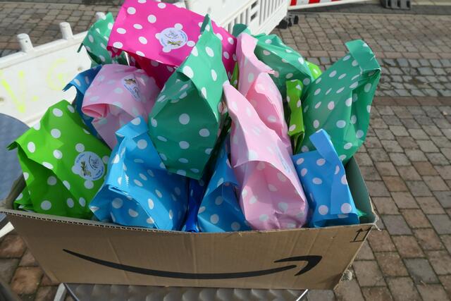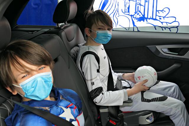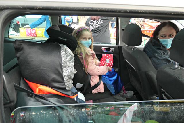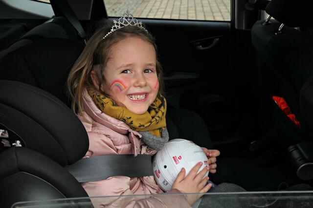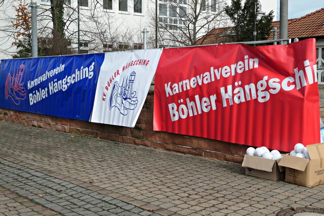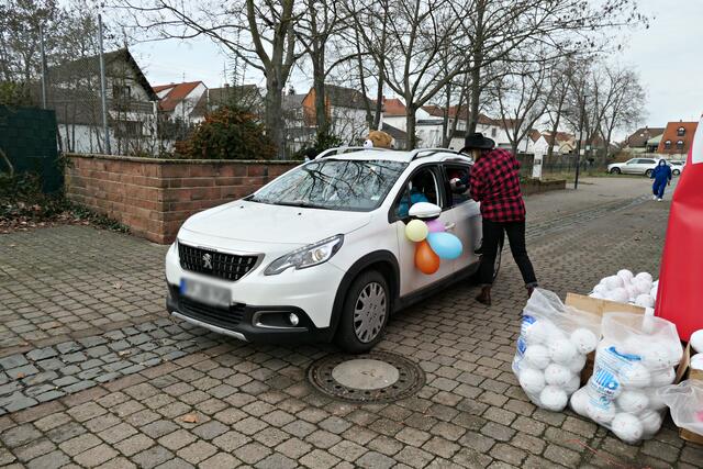 Offizieller Start war um 13.00 Uhr und sollte bis 17.00 Uhr gehen. Aber bereits ein paar Stunden vorher rückten die ersten Helfer an, um die Spuren für die Autofahrer/innen zu markieren, die zur Naschstraße Drive-in führen sollten. Zu Beginn von der Goldböhlstraße aus wurden erstmal die Anmeldungen gecheckt, denn jedes Kind musste angemeldet sein. Zum ersten, weil man wissen musste, wie viele bunte Tüten und Bälle etc. benötigt würden und zum zweiten wegen der Kontaktverfolgung in Coronazeiten. Die Kinder sollten verkleidet im Auto der Erwachsenen sitzen, das war die Bitte, aber keine Pflicht. Kein Kind sollte ohne Tüte heimfahren. Mit dieser Überraschungstüte wollen die beiden Böhl-Iggelheimer Karnevalsvereine Böhler Hängsching und Igg‘lemer Bessem wenigstens den Kindern in dieser tristen Zeit und der Faschingszeit ein bisschen Freude bereiten. Und dann hieß es „Ihr Kinderlein kommet“ zuhauf, denn es waren laut Sitzungspräsident Dominik Wittmann sage und schreibe 390 Anmeldungen eingegangen. Wittmann und ein paar der Igg‘lemer Bessem tummelten sich in ihren schicken Karnevalsroben auf dem Platz und bei Wittmann konnte ich unheimliche viele Buttons aus etlichen Kampagnen am Revers entdecken; kein Wunder, so lange wie er schon dabei ist.