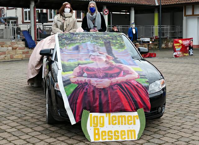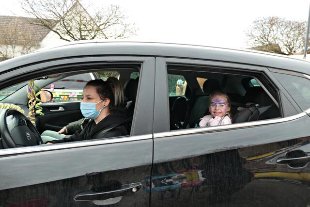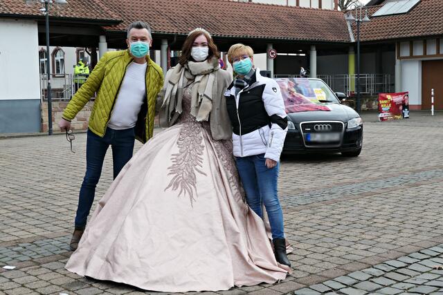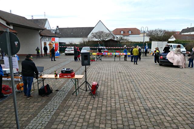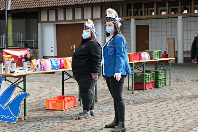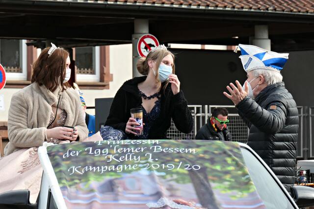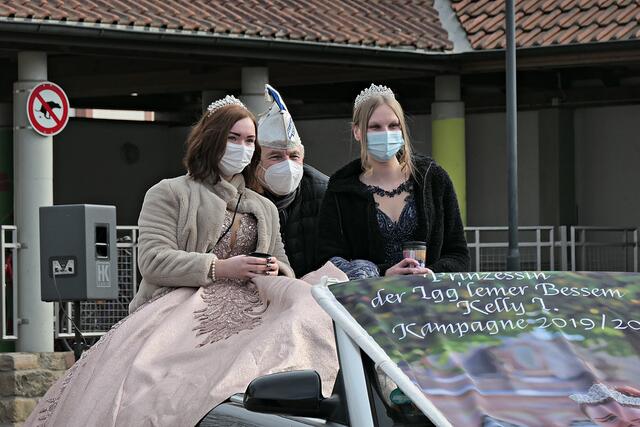 Etwas komisches Erscheinungsbild waren dieses Jahr die Masken, die auch die beiden Karnevalsprinzessinnen Kelly I. und Saskia I. trugen. Und auch in den PKWs galt medizinische Maskenpflicht bis der Platz wieder verlassen wurde. Der erste Beigeordnete der Gemeinde Karl-Heinz Hasenstab ließ es sich auch nicht nehmen, einmal das Geschehen vor Ort auf sich wirken zu lassen.