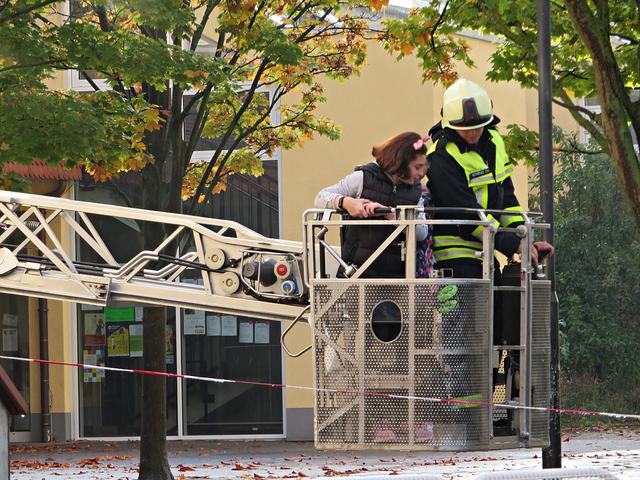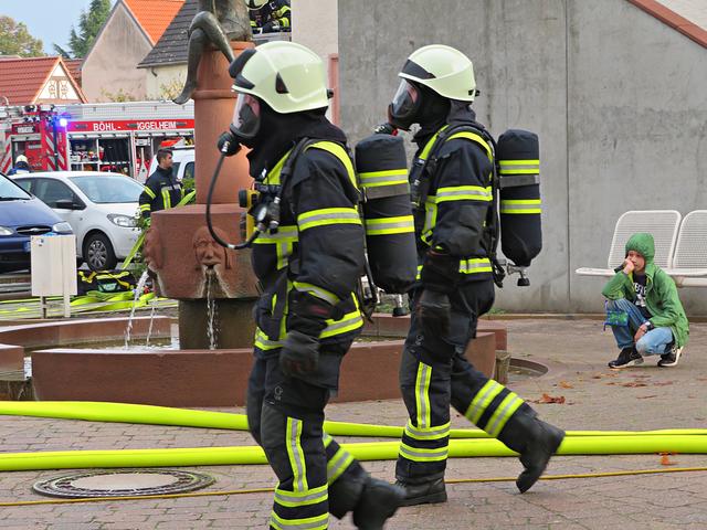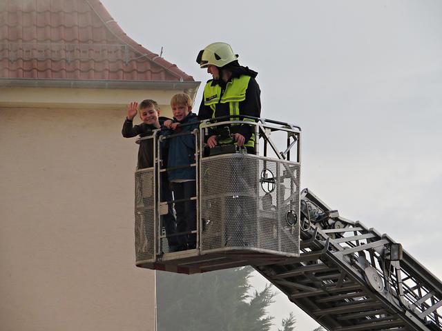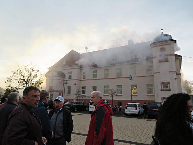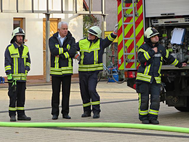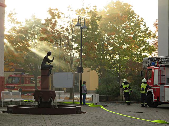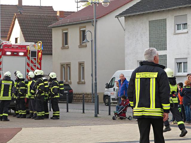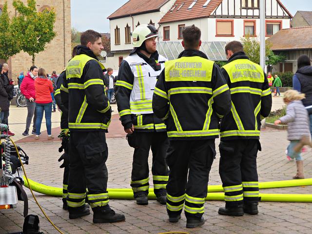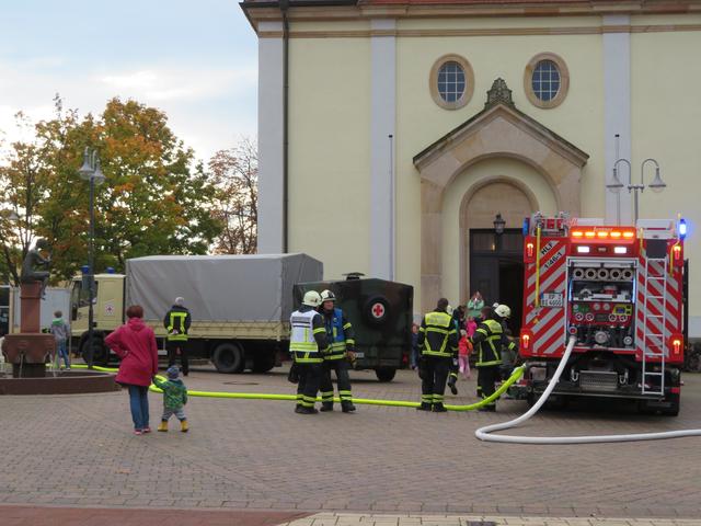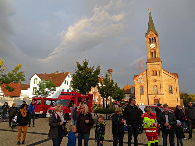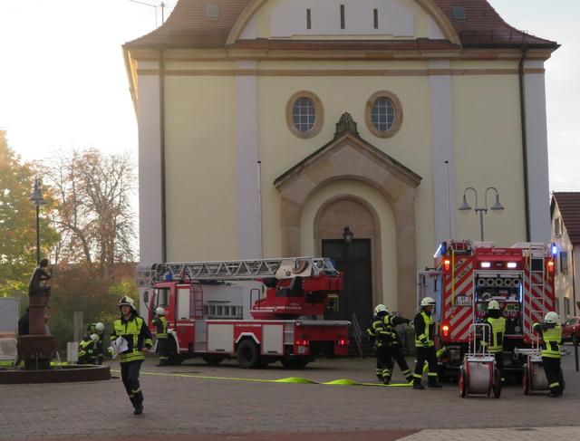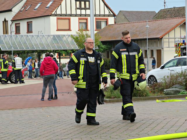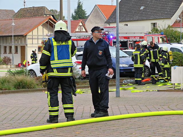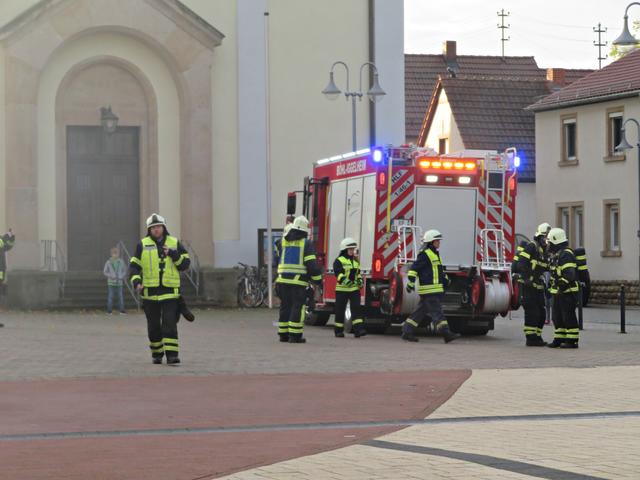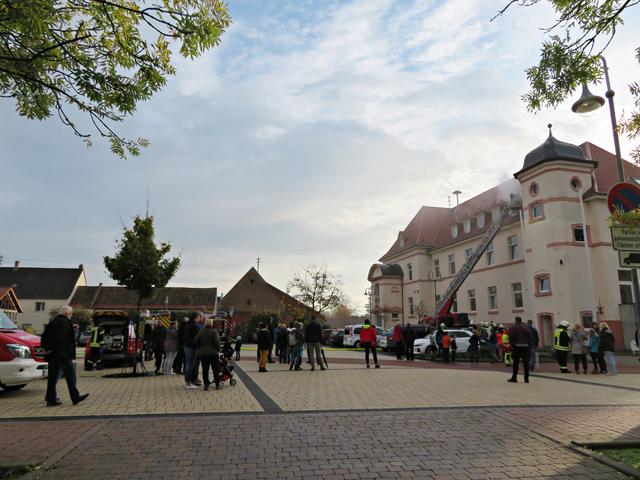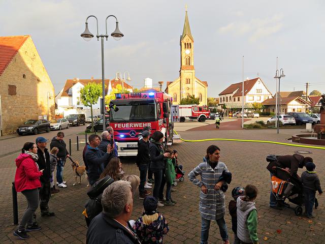 Böhl-Iggelheim, OT Böhl. Am 20.Oktober fand im Ortsteil Böhl die Jahreshauptübung der Freiwilligen Feuerwehr Böhl-Iggelheim statt. Bereits kurz vor der offiziellen Ankündigung für 8.30 Uhr qualmte es aus einem Fenster im Obergeschoß der Johannes-Fink-Grundschule in der Kirchenstraße mächtig. Die Feuerwehr rückte aus Iggelheim mit Blaulicht an und alles lief wie bei einem Ernstfall ab. Auch ein scheinbar Verletzter lag auf dem Boden und blutete aus der Nase. Sofort wurde sich seiner angenommen und in die stabile Seitenlage gebracht während die anderen Feuerwehrmänner sich des Brandherdes annahmen und behände die Drehleiter ausfuhren, um die im zweiten Stockwerk wartenden Schulkinder durch das geöffnete Fenster zu retten. Jedes Mal fuhr die Leiter nach oben und kam mit zwei bis drei Kindern wieder zurück auf den Boden, wo sie in Sicherheit waren. Alles ging ganz schnell wie in einer richtigen Notfallsituation. Es kamen immer mehr Feuerwehrautos auf den Platz gefahren und immer mehr Zuschauer vornehmlich mit Kindern beobachteten das Spektakel.
