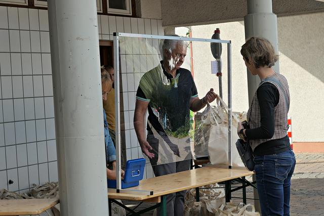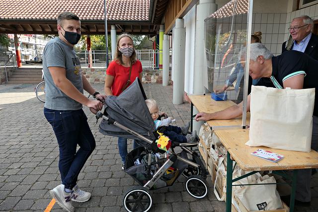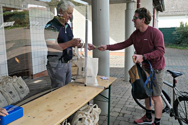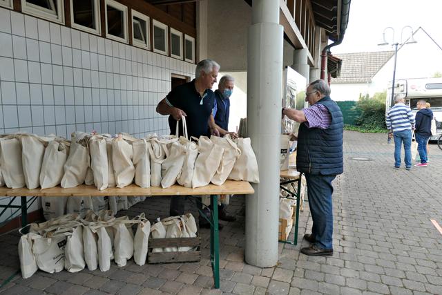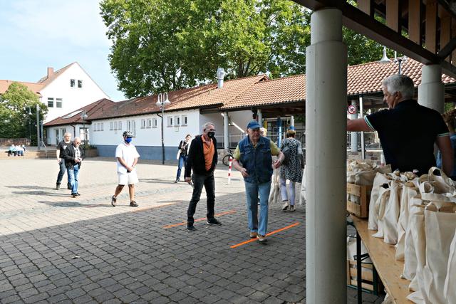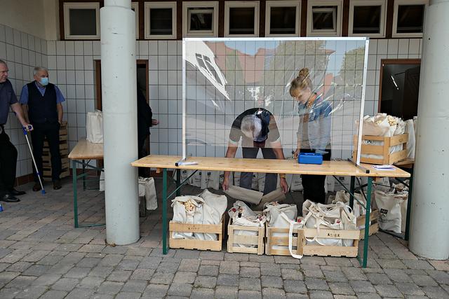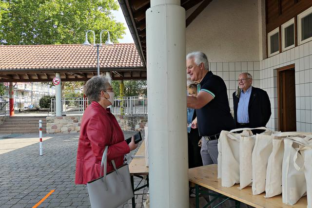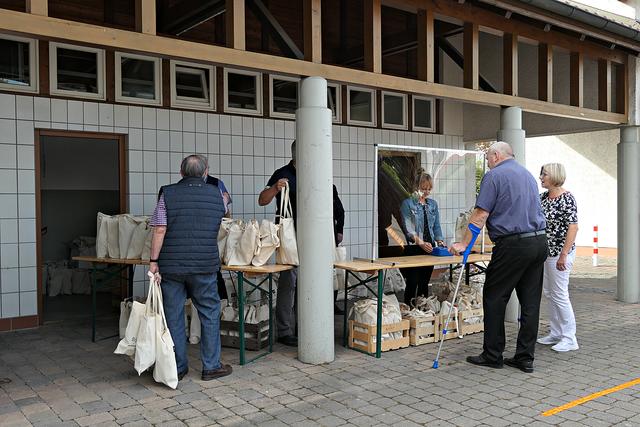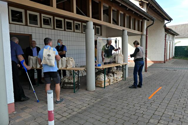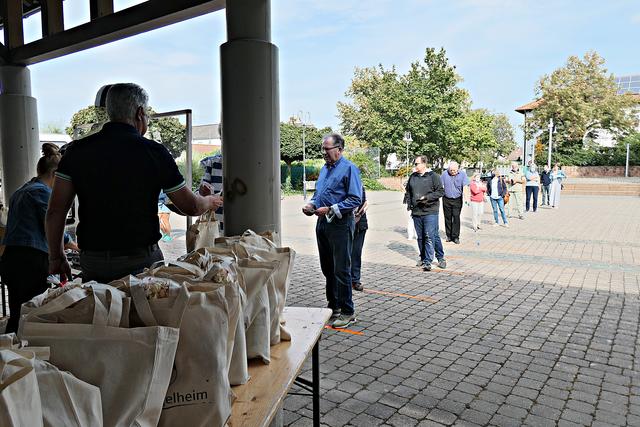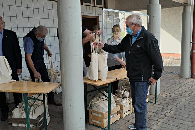Böhl-Iggelheim, OT Iggelheim. Nach der Böhler Kerwe folgt immer die Iggelheimer Kerwe und somit auch das Trostpflaster in Form der diesjährigen "Kerwedudd" mit allerlei Leckereien gefüllt, die man auch sonst live auf der Kerwe verzehrt. Nachdem der "Probelauf" in Böhl ein bisschen zu Unmut führte, weil die 150 Dudde so schnell vergriffen waren, beugte man hier in Iggelheim vor und stellte sage und schreibe 350 Tüten bereit. Da ich mich auf einen Ansturm gefasst machte, war ich bereits kurz nach 10.30 Uhr vor Ort. Bürgermeister Peter Christ, der auch diesmal wieder die Tüten hinter einer Plexiglasscheibe ausgab, wurde tatkräftig unterstützt von Bernd Johann, Karl-Heinz Hasenstab, Selina Wiegand und Sebastian Kraus - alle für die Gemeinde aktiv. Es hatte sich bereits eine Schlange wartender Kerwedudd-Käufer mit Sicherheitsabstand angestellt, so dass bereits vor offiziellem Start um 10.45 Uhr die ersten Dudde über den Biertisch wanderten. Das ging so fix, dass bereits 5 Minuten später die Schlange abgearbeitet war.