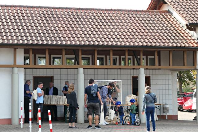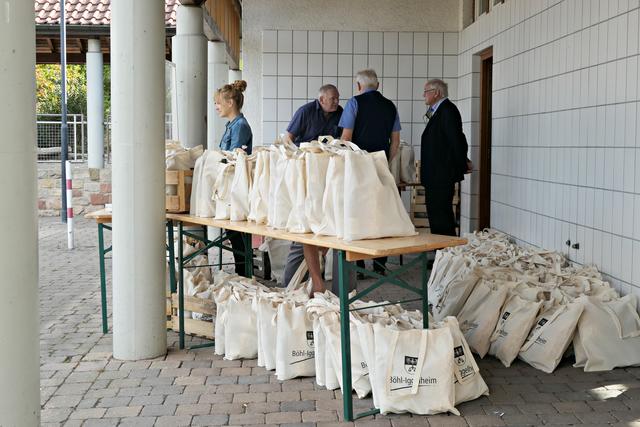 Man hörte öfter die Bemerkung "Is jo gar nix los bei eich", denn die Leute kamen tatsächlich nur "tröpfchenweise". Was war nur los? Es blieben dieses Mal noch viele Tüten übrig; Christ sprach von ca. 200 verkauften Tüten. Die restlichen 150 können dann am Empfang des Gemeindebüros zu den üblichen Bürozeiten für 20 Euro gekauft werden. Das Geld ist NICHT für das Gemeindekässel, sondern für einen guten Zweck, nämlich die Kerwebeschicker, die dieses Jahr leer ausgehen. (mel)
