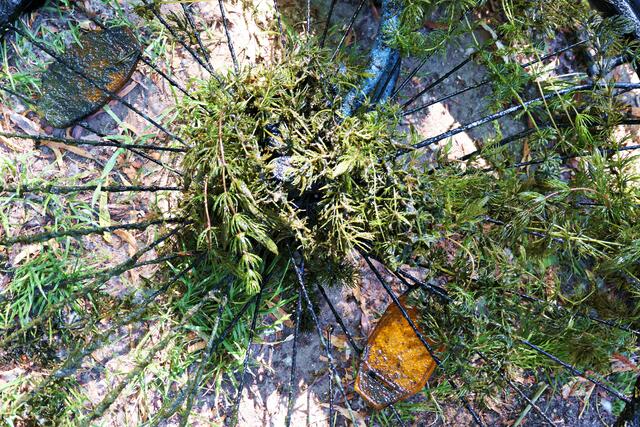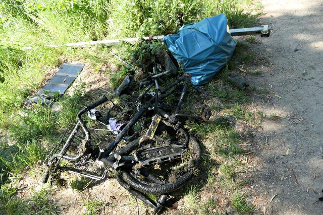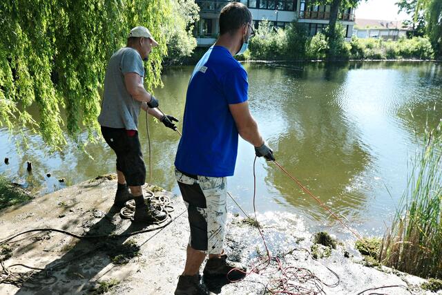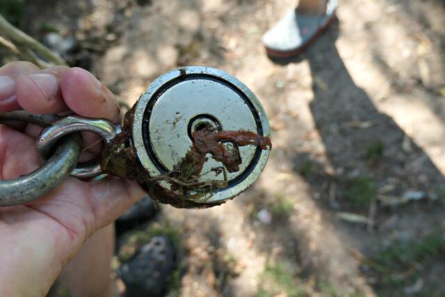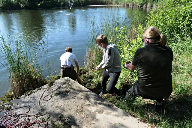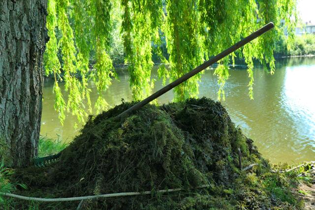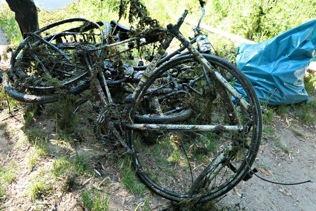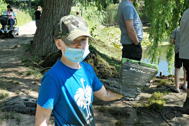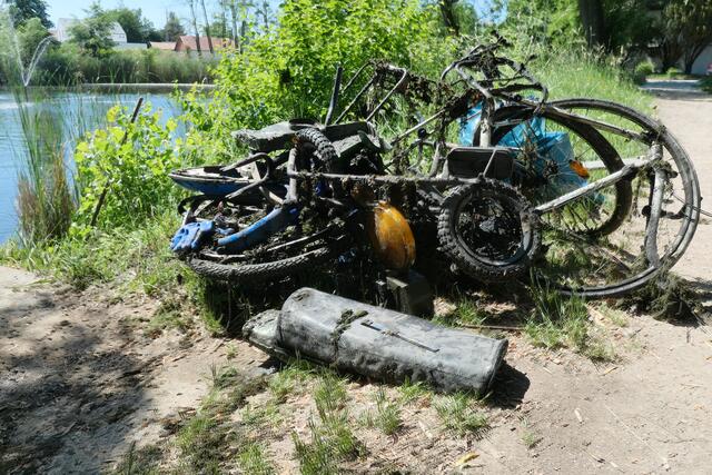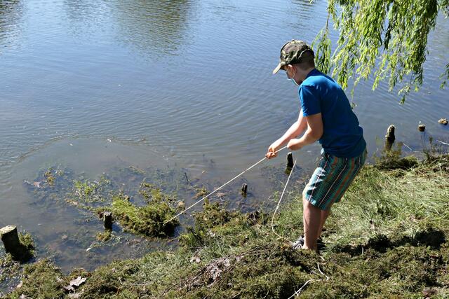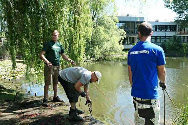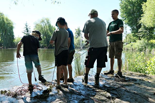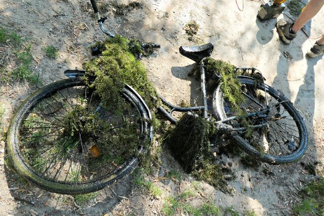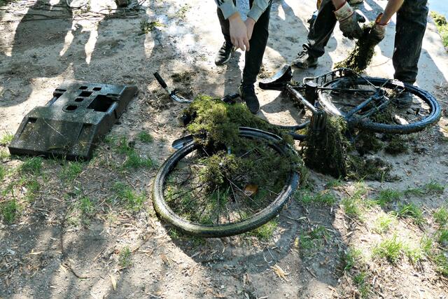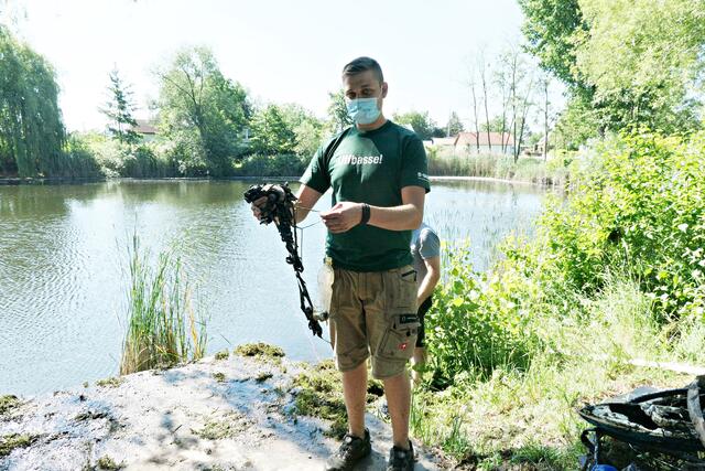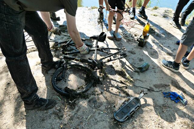 Angerückt war die Truppe mit blauen Säcken, Angeln mit Enterhaken und Magneten dran. Zuerst musste das Moos herausgeholt werden - hierbei handelte es sich um Hornkraut und andere Krautsorten. Das Abtragen der Schicht sei wichtig, damit man überhaupt mit dem Magneten auf etwas „stoßen“ könne, denn durch die Zentimeter dicken Moosschichten reiche die Anziehungskraft nicht. Hängt dann etwas am Haken, wird es an Land gezogen und das war einiges: Diverse Fahrräder und Teile davon, Schlösser, Münzen (da hat man wohl den Schwarzweiher mit dem Trevi-Brunnen verwechselt), CDs, Baustellenteile, einen Staubsauger und sogar ein fast komplettes Mofa wurde gehoben. Bei der Umrundung des Sees wurde man natürlich und leider auch fündig und entsorgte dann im blauen Sack leere Glasflaschen und Verpackungsmüll. Für den Metallschrott gibt es vielleicht eine Spende für die Jugendkasse!