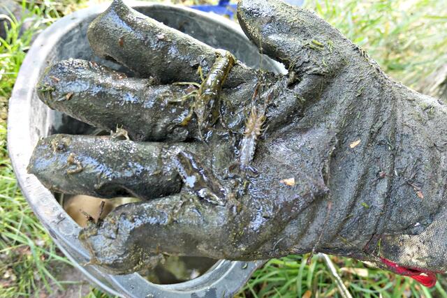 Uwe Schönknecht ist ebenfalls im Vorstand und als Gewässerwart tätig und weiß, was und wann geschnitten werden kann. Mit dabei war auch der Iggelheimer Christian Schilling, der die Gewässer analysiert und heute am Schwarzweiher Gewässerproben entnahm, um den pH-Wert zu bestimmen (Sauerstoffgehalt, Ammonium, Nitrat-, Nitrittests, Carbonathärte, Magnesium, Calciumgehalt). Er verschafft sich alle 3 Monate einen Überblick, weil in den unterschiedlichen Jahreszeiten immer andere Bedingungen am Weiher herrschen. So bilden sich im Sommer vermehrt Algen, die dann im Winter verfault im Wasser liegen.