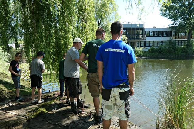 Böhl-Iggelheim, OT Iggelheim. Die Sonne meinte es sehr gut an diesem Sonntag, dem 13. Juni, als von 7.30 bis 12.00 Uhr Vereinsmitglieder des Angelsportvereins ASV Kellmetschweiher e. V. zum Großreinemachen an den Schwarzweiher anrückten. Mit dabei war auch der Nachwuchs, denn Jugendarbeit wird bei dem Verein sehr groß geschrieben.