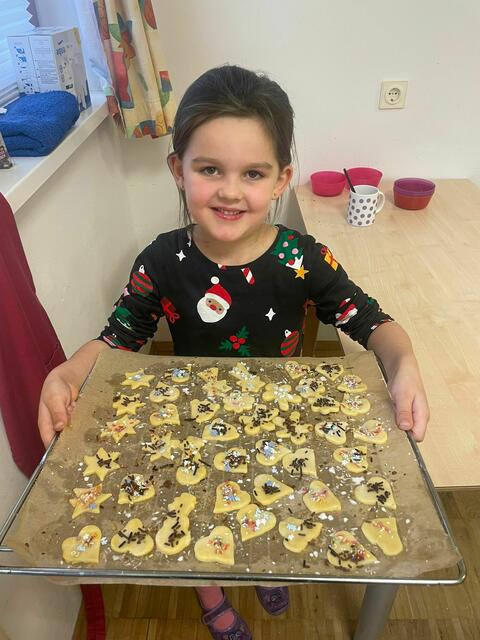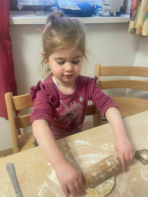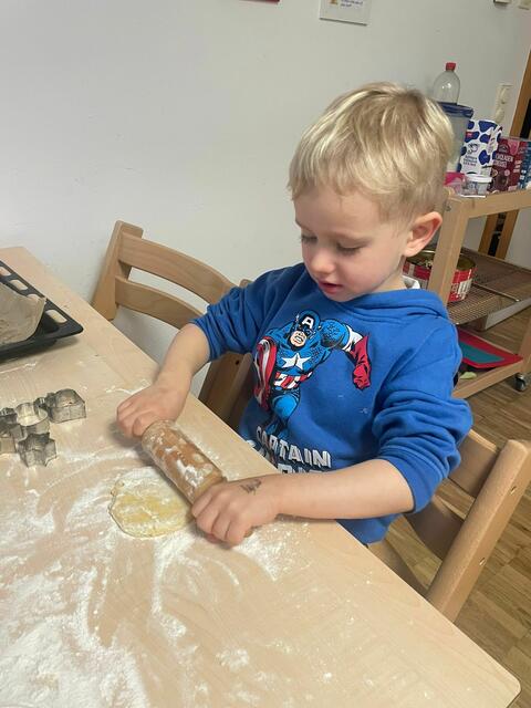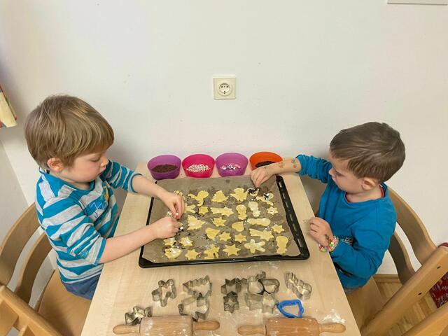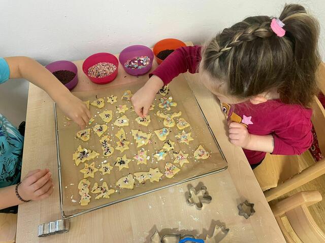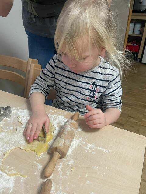 Und da alle guten Dinge bekanntlich drei sind stand die nächste Aktion des Elternausschusses schon am Montagmorgen nach dem Weihnachsmarkt an. Plätzchenbacken mit allen Kindern in der Kinderküche der Kindertagesstätte. Nacheinander wurden die Kinder pärchenweise gerufen und durften dann eine ganze Ladung Teig ausrollen, Plätzchen ausstechen und verzieren. Am Ende der beiden Back-Vormittage erhielt jede Gruppe des Kindergartens eine volle Dose mit leckerem Gebäck. So lässt sich die Vorweihnachtszeit natürlich richtig genießen.