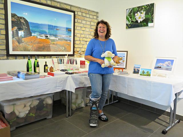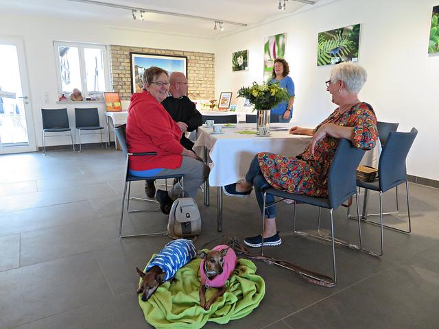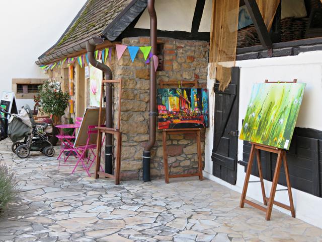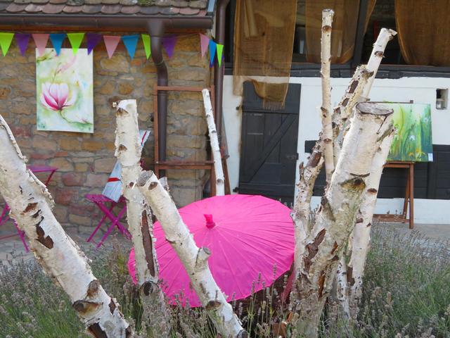 Zum Abschluss meines Kunstinteresses treffe ich auf die Hausherrin Tina Krauss, die momentan mit geschientem Bein ihr Leben meistert. In ihrem Atelier hängen schöne Fotogroßaufnahmen und im Außenbereich Gemälde ausgestellt. Sie selbst hat schon an mehreren Ausstellungen teilgenommen und ihr Fokus liegt auf Fotografien, Fotokunstkarten, Fotoschiebevorhängen, Fotolamellen und Fotorollos, die eine große Bandbreite abdecken. Sie probiert gerne Neues aus und entdeckt die Wirkung unterschiedlicher Ausdrucksformen. Sie ist eine feste Institution in Böhl-Iggelheim, wenn es um Kunst geht. Kontakt info@fotoart-lebenskunst.de