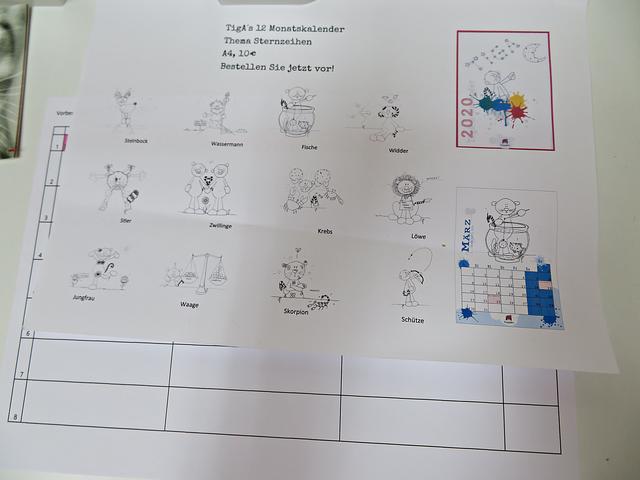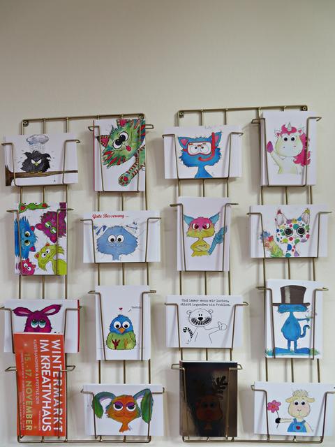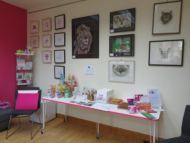 Als nächstes traf ich auf Yvonne Ißle in ihrem neuen Atelier im Kreativhaus, das sie seit Mitte August benutzt. Ihr Motto „Neu und anders sehen lernen wie andere Leute“ und die Erfahrung, wie man durch Fehler lernt. Ihre Bilder sehen wie Fotografien aus und das ist ein langwieriger Prozess wie sie erzählte. Das Bild wird durch fünf bis acht Schichten aufgebaut und durch Farbe raus- und reinsprühen gibt es die Tiefe. Jedes einzelne Haar wird letztendlich gemalt und durch Überlagerung entsteht die Tiefe. Auch Yvonne Ißle gibt in ihrem Atelier Kurse für Airbrush. Für das nächste Jahr hat sie einen Kalender entworfen mit Motiven ihres „Praktikanten“ TigA, und zwar zum Thema Sternzeichen. Sie hat ein paar Illustrationsfiguren zum Leben erweckt, wie zum Beispiel „TigA“ und die sympathische Familie der „Snöffies“. Diese liebevollen Illustrationen kann man bei ihr als „TigA-Buch“ erwerben, außerdem Tassen, Geschenksets und eine kleine Papeterie über diese wuselige Bande. Sie macht auch Auftragsmalerei in Airbrush. Yvonne Ißle begann mit der Malerei bereits in jungen Jahren autodidaktisch, ist freischaffende Künstlerin, diplomierte Aribrushdesignerin und Illustratorin und kann unter www.yvissart.de kontaktiert werden.