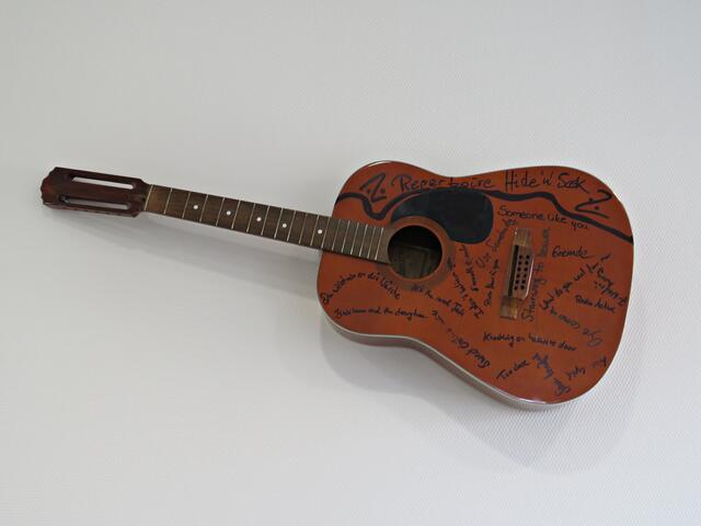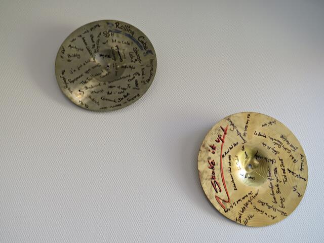 Aus den Räumlichkeiten drangen die unterschiedlichsten Musikinstrumente, denn das Interesse war sehr groß. Die Kleinen waren gerade dabei, Rasseln zu basteln, die sie später noch in einem Lied brauchen sollten. Der 4-jährige Jan Klehr hatte sein Instrument bereits gefunden und in Beschlag genommen: Das Schlagzeug! Im Eingangsbereich fand man viele signierte Dinge der Bands „Rolling Cube“, „Shake it up“ und „Hide’n’Seek“ mit sämtlichen Songs, die sie gesungen hatten; Schirmherr dieser Band ist natürlich Sascha Leicht, der nicht nur die Musikschule leitet, sondern auch ein Tonstudio sein eigen nennt, in dem Sänger und Gitarrist Thiemo Gerrit seine erste CD aufgenommen hat.