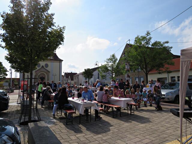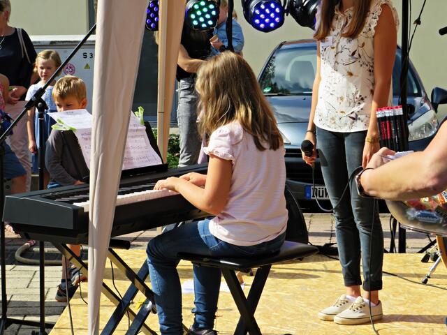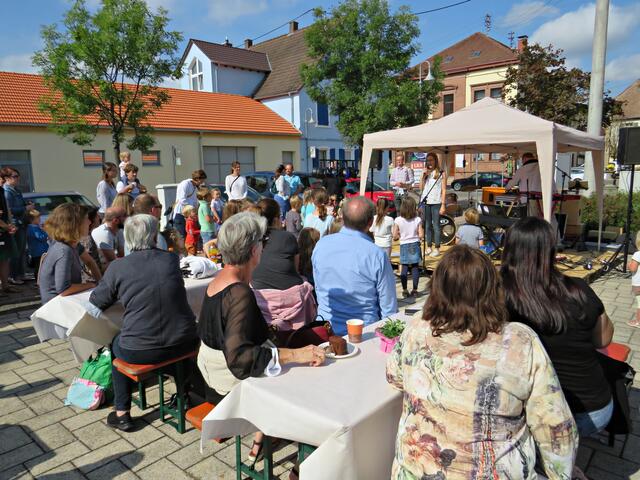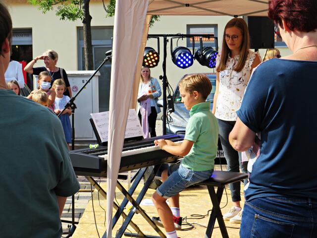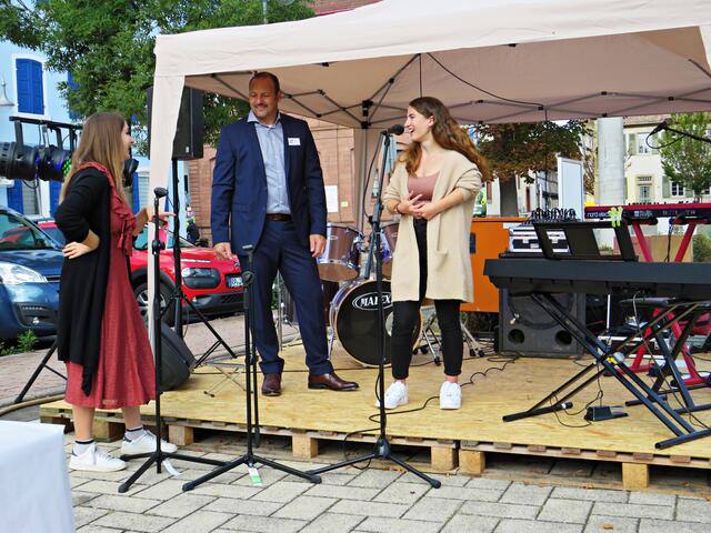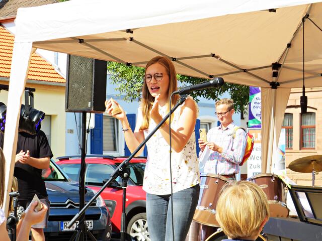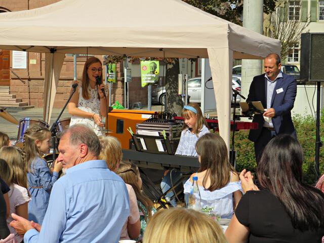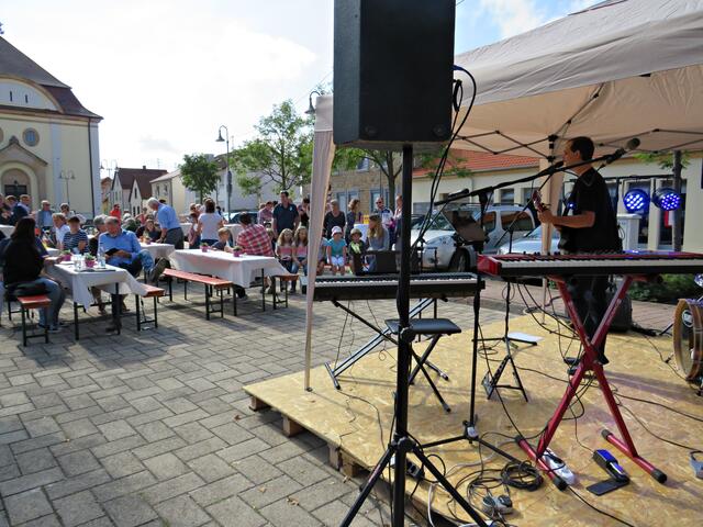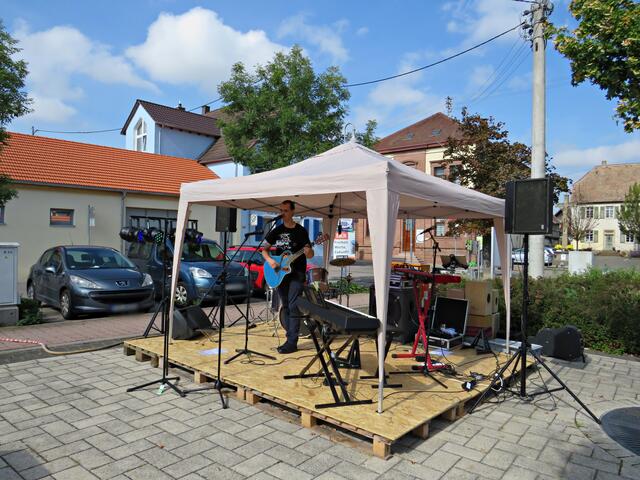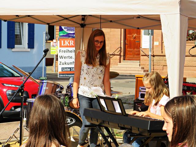 Böhl-Iggelheim. Kam man um 11.00 Uhr des 19. September auf den Dorfplatz in Böhl staunte man nicht schlecht über eine Bühne mit Musikequipment und Biergarnituren sowie Stehtischen, alle schön bezogen und mit Blümchen geschmückt. Dem Wetterbericht kann man nicht immer Glauben schenken, denn es gab Kaiserwetter. Hier auf dem Platz sollte heute Live-Musik zu hören sein und in dem gegenüberliegenden Gebäude in der Schulstraße 48a konnte man sich einen Eindruck von der Musikschule Sascha Leicht beim „Tag der offenen Tür“ machen. Die Verpflegung übernahm der Förderverein des Protestantischen Kindergartens Böhl. Nach Luca-App-Registrierung bei vier jungen Damen, die sich unter anderem um Anmeldungen kümmerten, konnte man sich im Freien ohne Maske bewegen, lediglich in den Räumlichkeiten war Maske angesagt.
