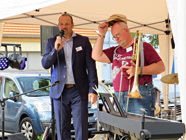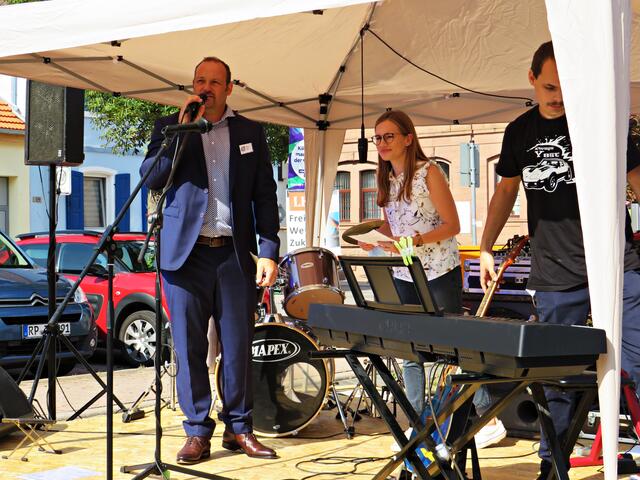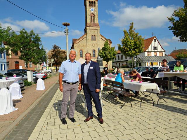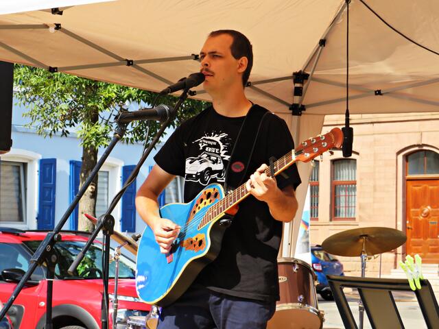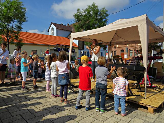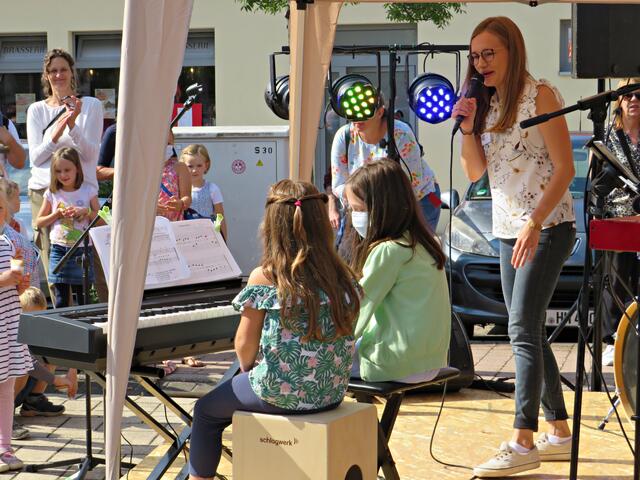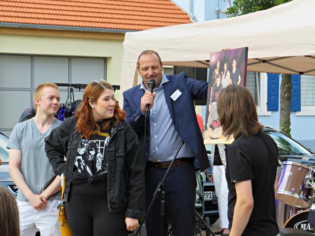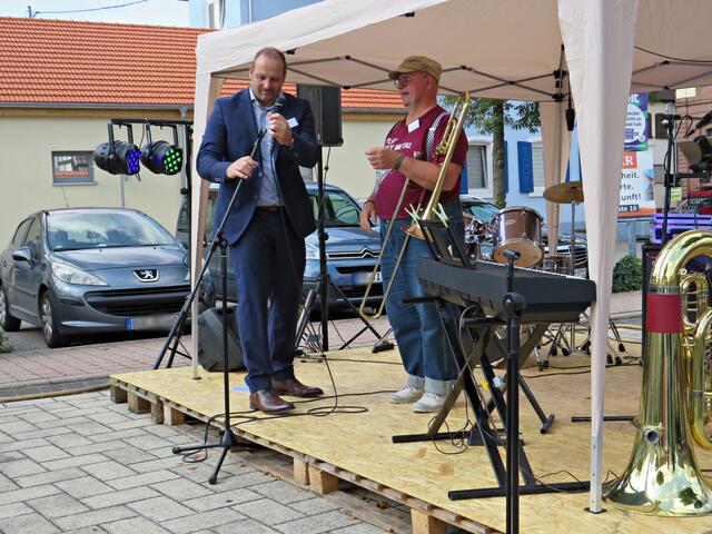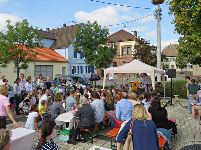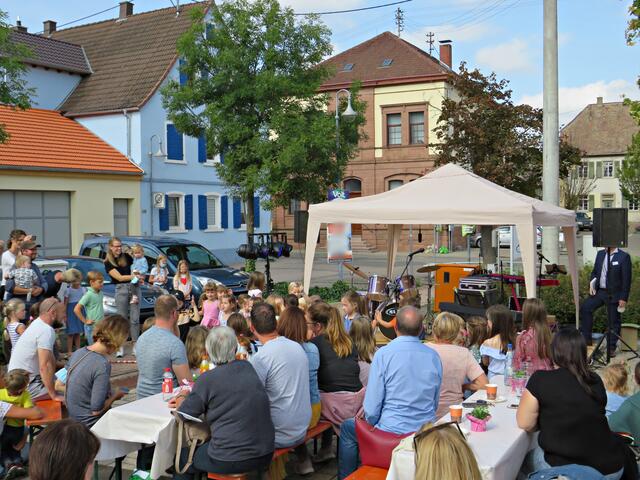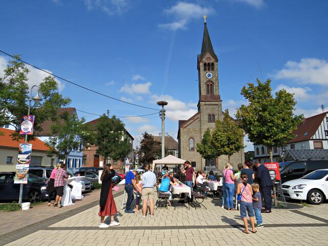 Böhl-Iggelheim. Kam man um 11.00 Uhr des 19. September auf den Dorfplatz in Böhl staunte man nicht schlecht über eine Bühne mit Musikequipment und Biergarnituren sowie Stehtischen, alle schön bezogen und mit Blümchen geschmückt. Dem Wetterbericht kann man nicht immer Glauben schenken, denn es gab Kaiserwetter. Hier auf dem Platz sollte heute Live-Musik zu hören sein und in dem gegenüberliegenden Gebäude in der Schulstraße 48a konnte man sich einen Eindruck von der Musikschule Sascha Leicht beim „Tag der offenen Tür“ machen. Die Verpflegung übernahm der Förderverein des Protestantischen Kindergartens Böhl. Nach Luca-App-Registrierung bei vier jungen Damen, die sich unter anderem um Anmeldungen kümmerten, konnte man sich im Freien ohne Maske bewegen, lediglich in den Räumlichkeiten war Maske angesagt.
