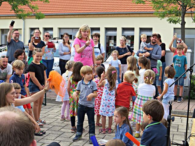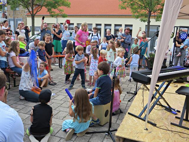 Lisa Geiger, Leiterin für die musikalische Früherziehung, führte als nächstes weiter durch das Programm, in dem 30 Kinder ihre Generalprobe und ihre Auftritte hatten. Bei der Rassel-Mitmachaktion konnten dann alle mitmachen, auch die Zuschauer. Alle machten begeistert mit als es hieß „mitklatschen, Füße stampfen, Popos wackeln und hüpfen“. Besonders erfreut war der Vater von Sascha Leicht als ihm zum Ehrentag „Happy Birthday“ vom kleinen Karl auf dem Klavier gespielt wurde. Es folgten noch die „Ballade pour Adeline“ und „Der Kuckuck und der Esel“, zeitweise während Corona online gelernt. Auf den Cajons sitzend klopften vier Kinder den Takt und bei der „turbulenten Autofahrt“ durften sich die Zuschauer anstatt auf dem Cajon auf die Oberschenkel klopfen. Die Stimmung wurde immer ausgelassener! Nach dem „Waldemar-Dackel“ bekamen alle Kinder dann zur Belohnung Süßigkeiten.