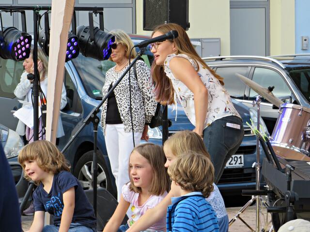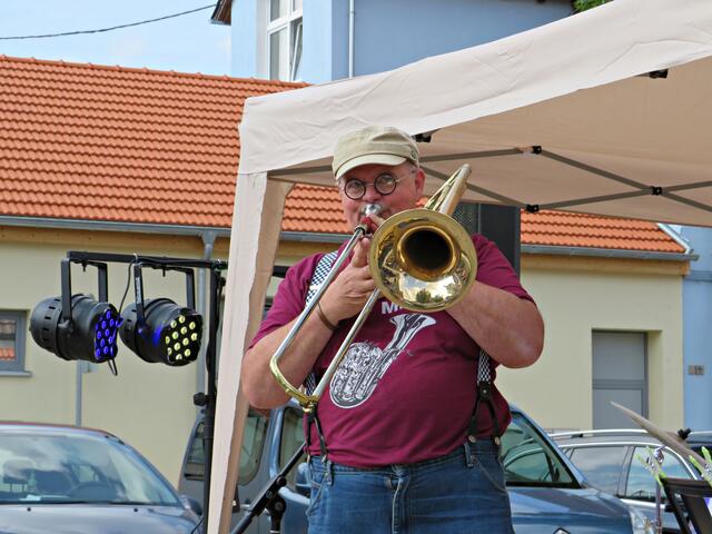 Der Platz füllte sich immer mehr und auch der frisch aus dem Urlaub zurückgekehrte Bürgermeister des Ortes Peter Christ war kurz hier. Thiemo Gerrit hatte seinen ersten Auftritt an diesem Tag als Solist und spielte verschiedene rockige Songs von den Eagles, Creedence Clearwater Revival, Simpel Dimpel und Countrysongs. Sogar ein portugiesisches Lied gab er zum Besten, obwohl er keine Ahnung hatte, was er da von sich gab. Aus seinem neuen Album hörte man zum Abschluss einen Blues „There is no money“.