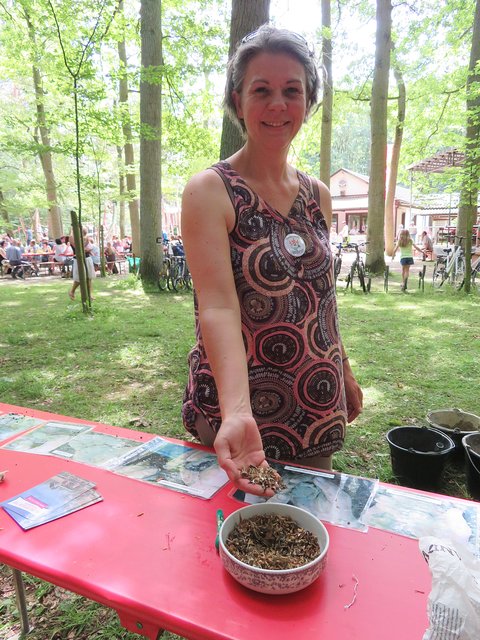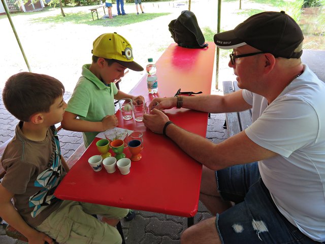 Eine weitere Attraktion war Micky Maus, die Luftballons an die Kinder austeilte. Manchen Kindern war diese Figur allerdings nicht ganz geheuer je nach Alter. Und so wurde entweder gelacht oder geweint. In der Bastelecke wurden aus Weinkorken und bunten Perlen zum Beispiel Kraken, Regenbogen oder wie gerade wieder fußballmäßig aktuell in Deutschlandfarben Schlüsselanhänger gefertigt. Zwei Esel, die Vereinsmitgliedern gehören, durften und sollten von den Kindern per Hand mit Möhren gefüttert werden. Wer das noch nie gemacht hatte, freute sich sehr über dieses Erlebnis. Auf dem Spielplatz kletterten gerade Julian und Moritz. Der Kleinere von beiden wurde von seinem Papa zur Sicherheit an die Hand genommen. Ein besonderes Mitbringsel für den heimischen Garten sind die selbst geformten Saatkugeln, die allerlei Samen enthalten und somit im Blumenbeet für eine Überraschung sorgen. Als besonders tricky erwies sich das „Jonglieren“ eines Tischtennisballes von Glas zu Glas, die unterschiedlich hoch waren. Besonders gut Pusten konnten die Brüder Eliyo und Joel, die nächstes Jahr bestimmt wiederkommen werden. (mel)