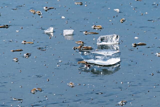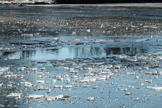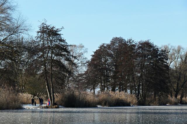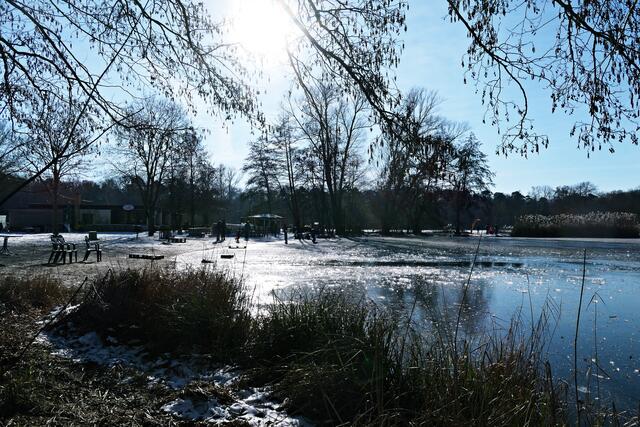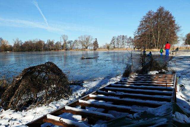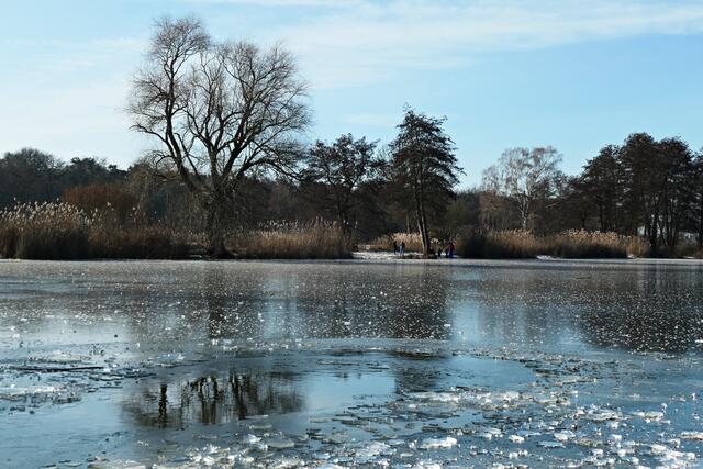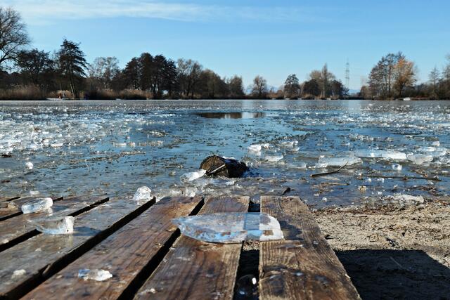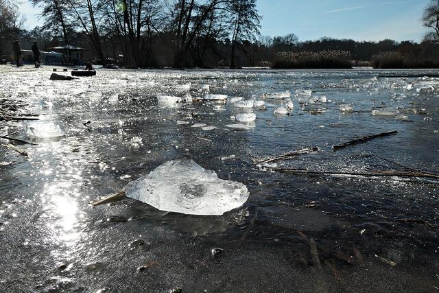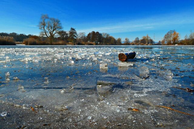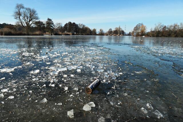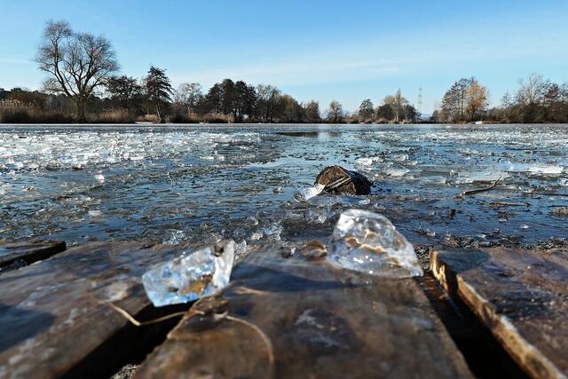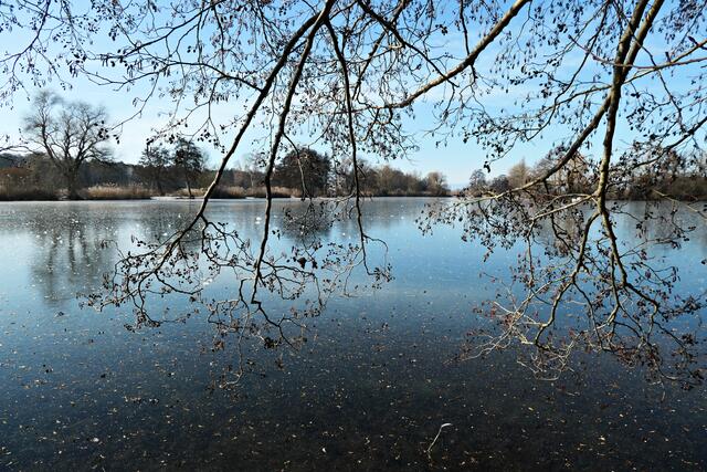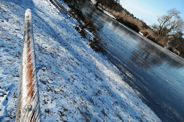 Böhl-Iggelheim. Die letzten Tage war es nach dem Dauerregen sehr sehr kalt und somit nicht verwunderlich, dass sogar der große Niederwiesenweiher zwischen Böhl-Iggelheim und Schifferstadt zugefroren war. Am Vormittag des 14. Februar machte ich mich mit der Kamera bewaffnet auf, um ein paar Eindrücke einzufangen. Der Weiher sieht zwar zugefroren aus, aber es war ein größeres Loch in die Eisfläche geschlagen worden und man konnte sehen, dass das Eis nicht ganz so dick war, damit man auf ihm bedenkenlos laufen könnte. So war es ratsam, sich nur in Ufernähe auf dem Eis zu bewegen.