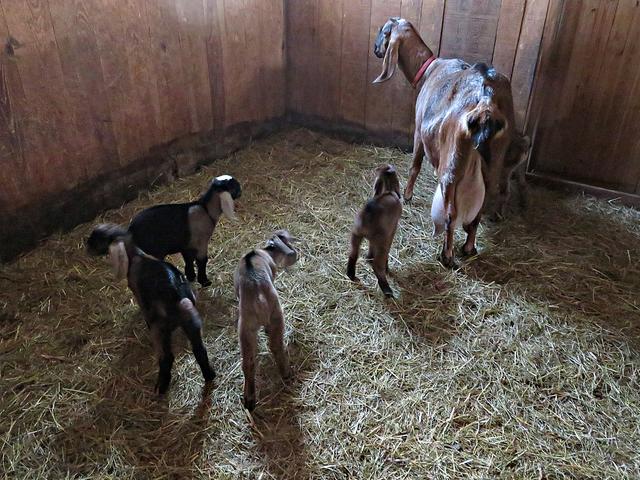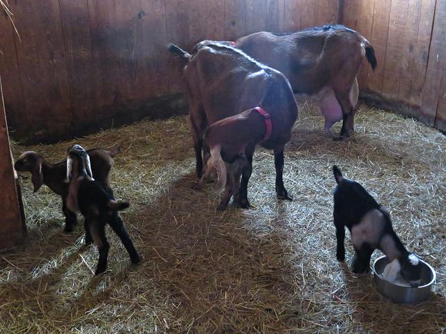 Die Ziegen teilen sich den großen Stall mit den Schwalben, aber erst wenn sie im Frühling wieder einfliegen. Noch ist es ihr alleiniges Reich. Der Ziegenbock, der das mit dem Nachwuchs verbockt hat, wurde in einen separaten Stall verbracht, da er sonst vielleicht gleich wieder decken würde, die Mamas sich aber erstmal erholen und um die Kleinen kümmern müssen. Der Nachwuchs wird zum größten Teil an Züchter abgegeben.