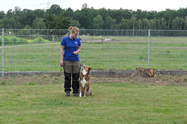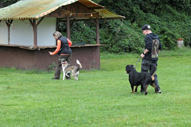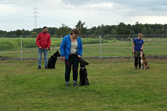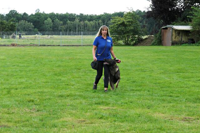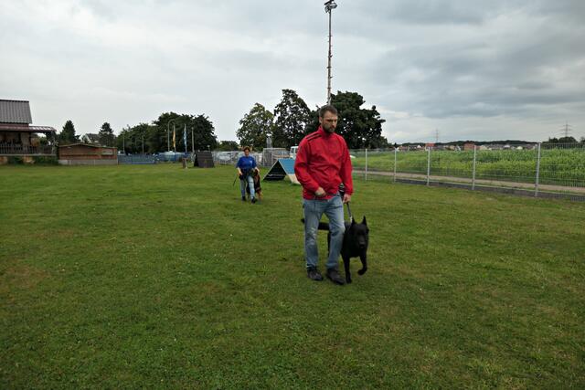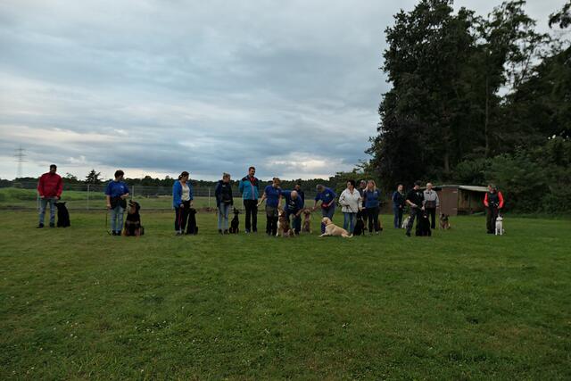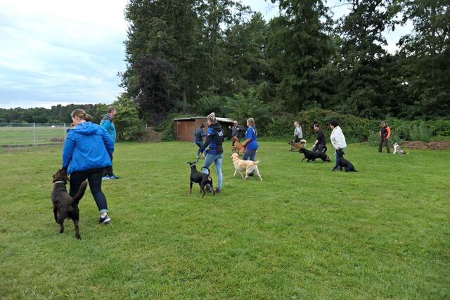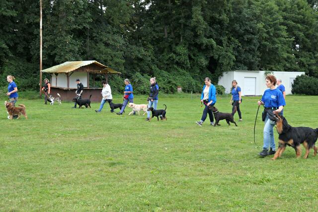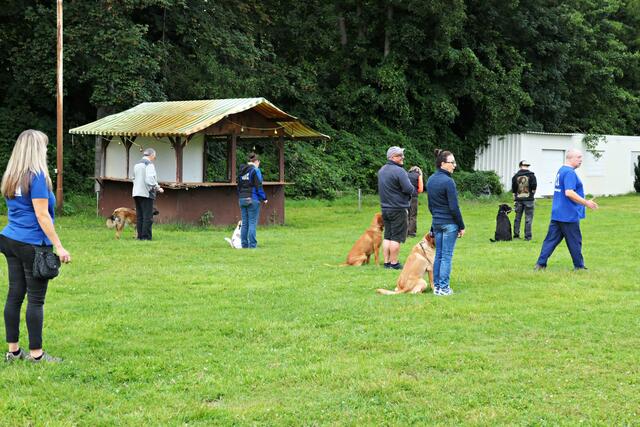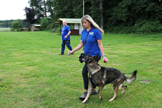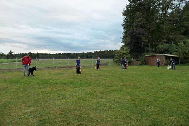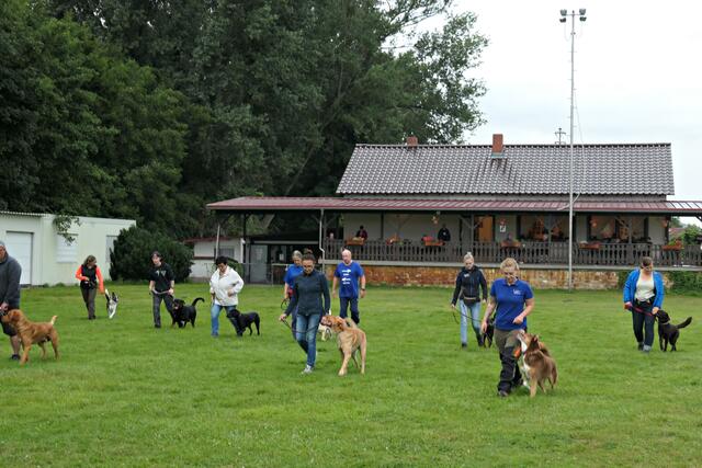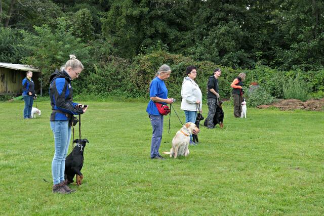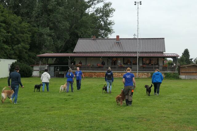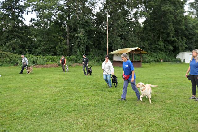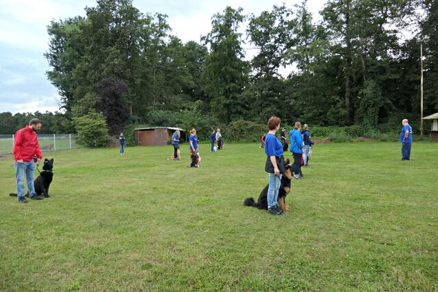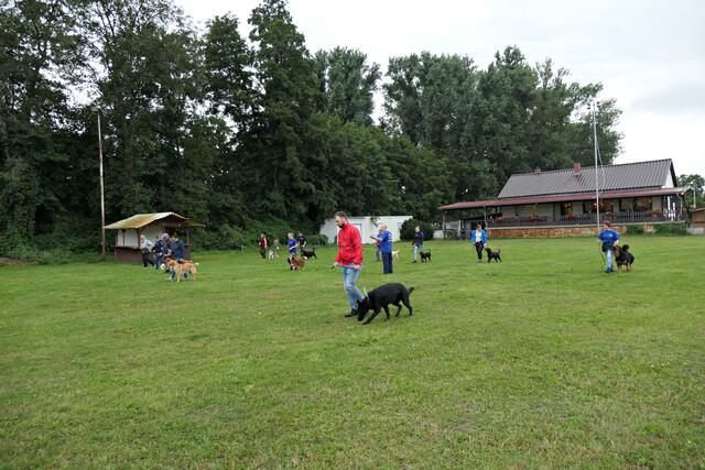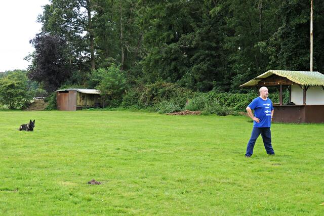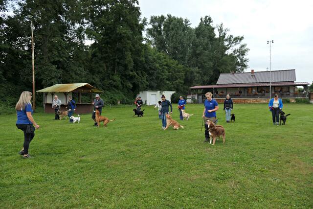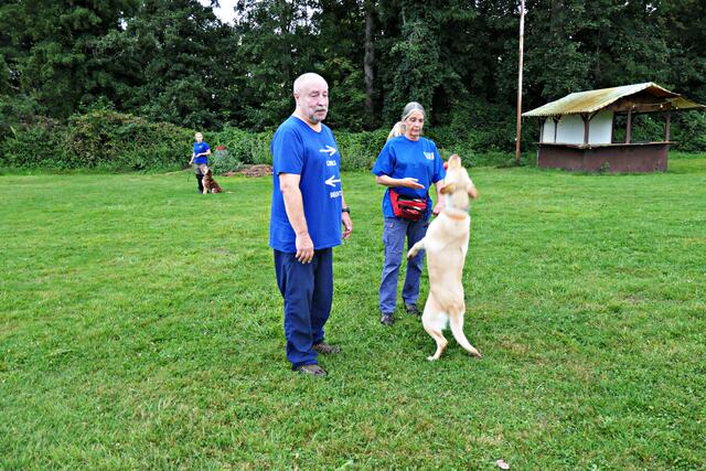 Hervorzuheben ist „Urgestein“ Stefan Quell, der bereits seit über 30 Jahren hier ist und sich seit 25 Jahren als Trainer voller Hingabe um die Hundeerziehung kümmert. Die Hundeunterordnung wird in der ganzen Gruppe trainiert; hier lernen sie richtiges Benehmen und Verhalten. Das Ziel ist die Begleithundeprüfung, die normalerweise im Herbst stattfindet, wenn nicht gerade Corona einen Strich durch die Rechnung macht. In dieser Prüfung wird gefordert, dass der Hund bei Fuß folgt, Platz macht und sich bei seinem Lauf an seinem Besitzer orientiert. Begleithunde und Mitglied sind so lange hier bis das geschafft ist; da die Hunde in der Regel nur auf das Verhalten des Halters reagieren, lernen sie vielleicht 20 %, den Großteil an Erziehungsarbeit – also ca. 80 % - müssen die Trainer jedoch am Hundehalter leisten. Ein Erziehkurs dauert in der Regel 12 Wochen.