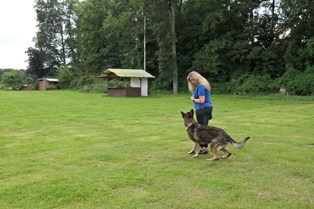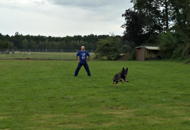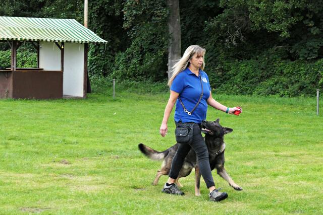 Böhl-Iggelheim. Am 27. August konnte ich mir auf dem Hundetrainingsplatz vom Verein der Hundefreunde Iggelheim 1910 e.V. (VdH, Mühlwiesenstraße 25) einen Einblick in die Erziehung von Hunden verschaffen. Es gibt ca. 150 Mitglieder in Böhl-Iggelheim; da nur lokale Mitglieder ist es ein relativ kleiner Verein. Meine Gesprächspartner waren Vorstand Andreas Zabanoff, der auch als Trainer für Welpen und Junghunde agiert, Stefan Quell als Cheftrainer und Übungsleiter sowie Silke Herder als Trainerin, die als erstes mit ihrem 8-jährigen Deutschen Schäferhund Coccer auf den Platz kam. In der Hand hielt sie einen „Kong“, nein, nicht King Kong, sondern etwas kleiner als Spielzeug, ein Ball, der als Beute herhalten soll. Coccer ist ein „Vorzeigehund“ und es machte eine riesen Freude, dem Zusammenspiel zwischen ihm und Frauchen (Silke Herder) zuzuschauen. Die Augen waren unverwandt auf sie gerichtet und er wich nicht mehr als 10 cm von ihr ab. Als Belohnung für seinen Gehorsam bekam er das Spielzeug/Beute, das er ca. 1 Minute lang nicht mehr los ließ.