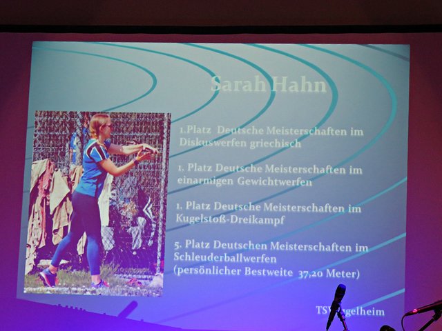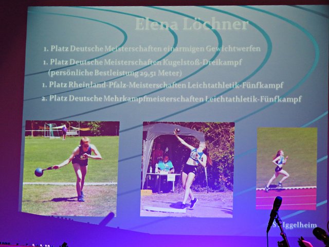 Der Leichtathletikverein TSV Iggelheim hatte zwei junge Damen „im Rennen“. Die 18-jährige Elena Löchner feierte im Jahr 2018 etliche Spitzenerfolge. Der erste Platz bei den Deutschen Meisterschaften in Mutterstadt im einarmigen Gewichtwerfen und im Kugelstoß-Dreikampf, der erste Platz bei den Rheinland-Pfalz-Meisterschaften in Ramstein bei einem Fünfkampf und der zweite Platz bei den Deutschen Mehrkampfmeisterschaften des Turnerbundes in Einbeck im leichtathletischen Fünfkampf. Die 28-jährige Sarah Hahn holte ihre Erstplatzierungen allesamt bei den Deutschen Meisterschaften in Mutterstadt im griechischen Diskuswerfen, einarmigen Gewichtwerfen und im Kugelstoß-Dreikampf. Einen fünften Platz im Schleuderballwerfen mit einer persönlichen Bestleistung von ihr erreichte sie bei den Deutschen Meisterschaften in Heuchelheim. Die beiden anderen Leichtathleten auf dem Foto sind Yanik Braun und Selina Zimmermann, die zwar in Böhl-Iggelheim wohnen, jedoch in Haßloch trainieren.