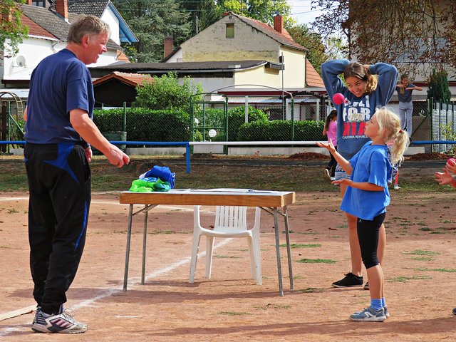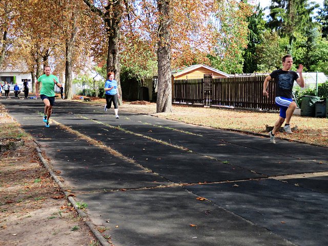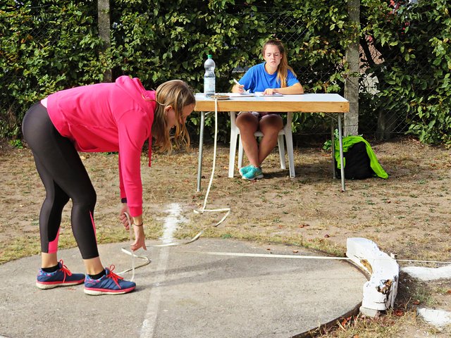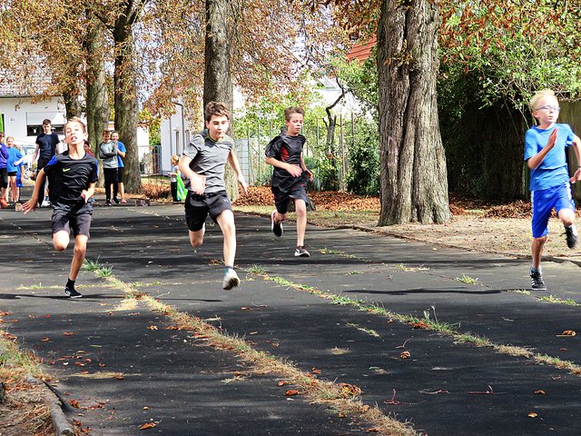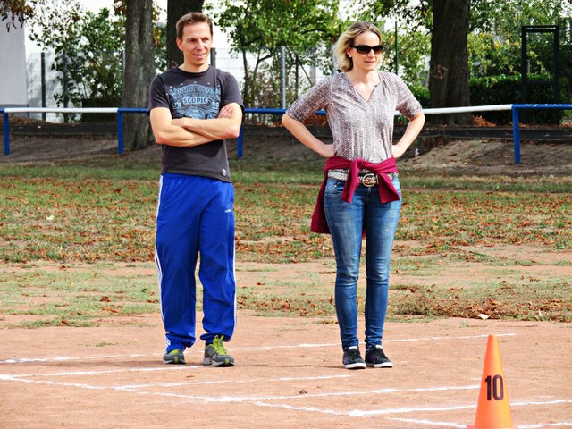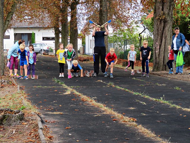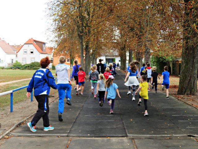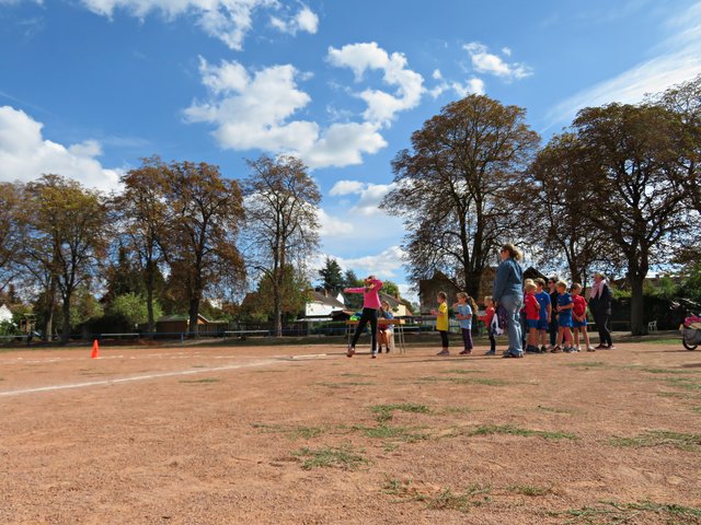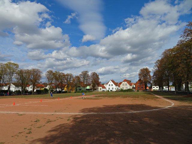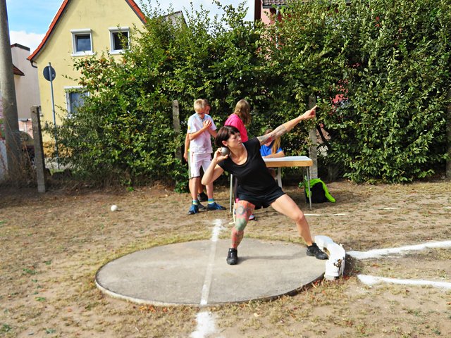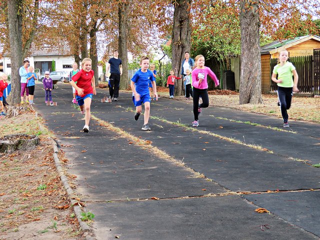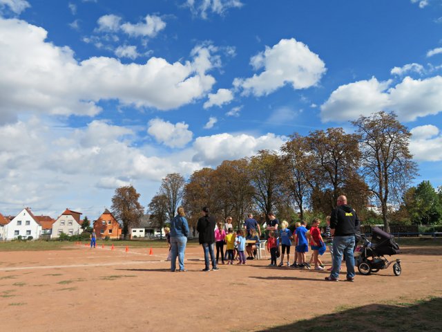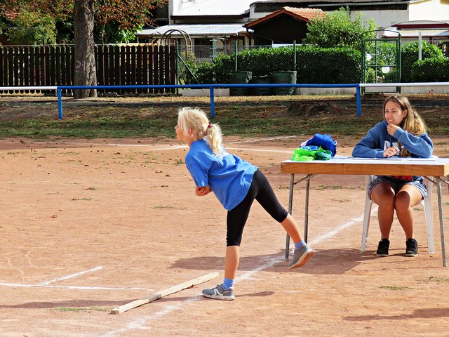 Die Wettkämpfe begannen mit den Kurzstreckenläufen – zuerst die 100-Meter-Sprints und dann die 50-Meter-Sprints. Ich sah besonders bei den Kleinen eine große Freude in den Gesichtern, die mit Eifer bei der Sache waren. Es folgte der Weitsprung und parallel der Ballweitwurf. Da das Kugelstoßen erst ab dem Alter von 12 Jahren erfolgen kann, entspannte sich hier der Andrang. Nach den Dreikämpfen konnte man noch Einzeldisziplinen hinzunehmen, wie zum Beispiel den Hochsprung. Und zum Abschluss fanden dann die 800-Meter-Läufe für die „Kleinen“ und die 3000-Meter-Ausdauerläufe der „Großen“ zum Erlangen des Sportabzeichens statt.