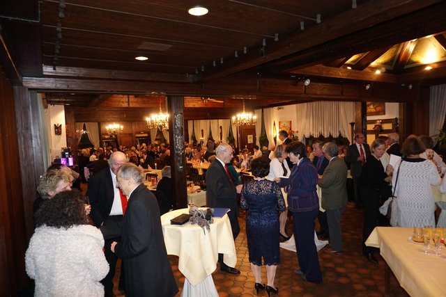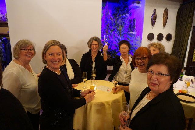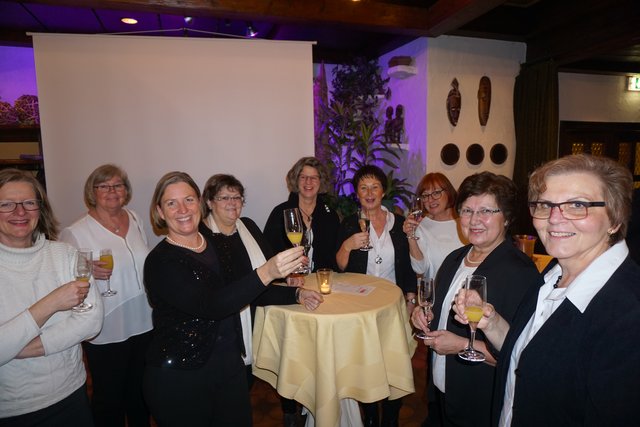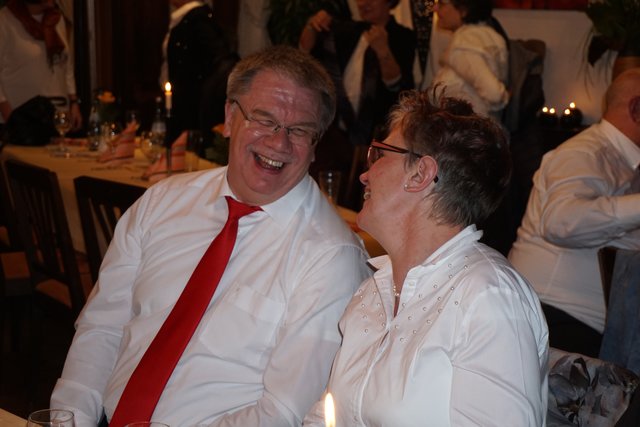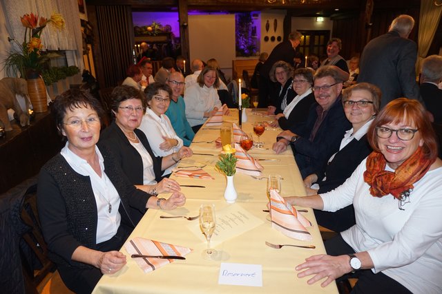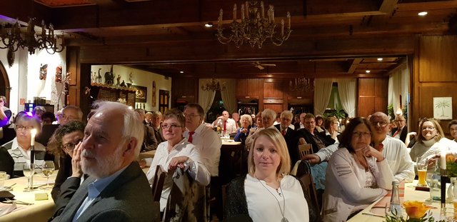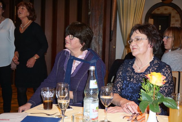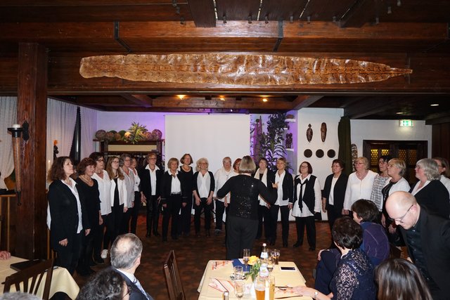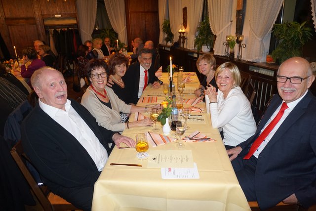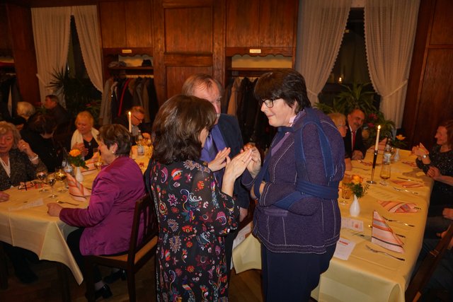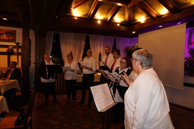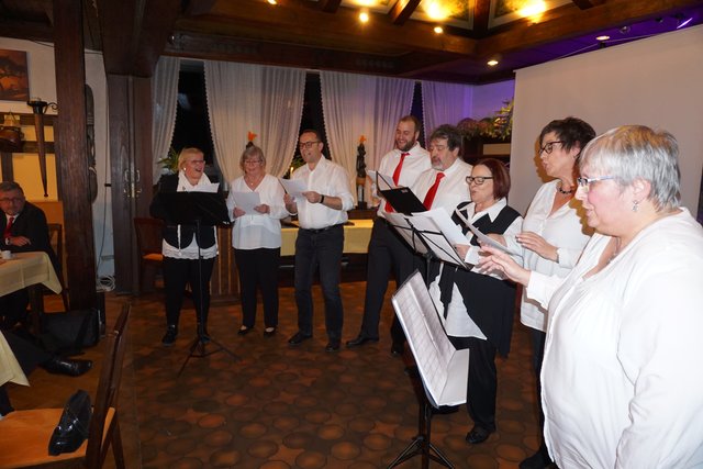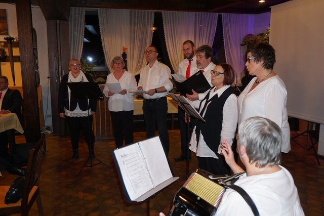 An dieser Stelle sei jetzt aber noch erwähnt, dass die Feierlichkeiten nach dem Essen noch lange nicht zu Ende waren, denn jetzt ging erst richtig die Post ab, denn es galt die erste gemeinsame „Party“ im 100-jährigen Bestehen zu feiern. Es folgten noch eine Vielzahl unterschiedlicher Darbietungen, welche als „Überraschungen“ von den Vereinsmitgliedern in Eigenregie einstudiert und dargeboten wurden. So hatten unter der Federführung von Gabriele und Peter Haustein zwei extra für den Abend arrangierte „Ensembles“ in jeweils leicht abgewandelter personeller Zusammenstellung ihren ersten Auftritt. Schon der besonders vorgesungene Evergreen „Im Wagen vor mir fährt ein junges Mädchen“ animierte die Anwesenden zum Mitsingen. Es folgte noch der Folksong „Lavenders Blue“, der auch aus einem Walt Disney Film bekannt ist. Der Oberkracher war dann sicherlich aber das sogenannte Sacklied „Schippeschippeschipp“, ursprünglich von Caterina Valente, die als reine Damen-Nummer mit Gitarrenbegleitung und mit Sack-Kostümierung gekonnt in Szene gesetzt wurde.