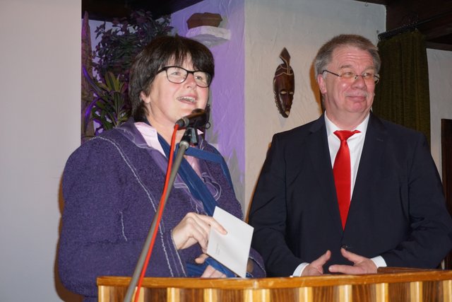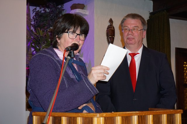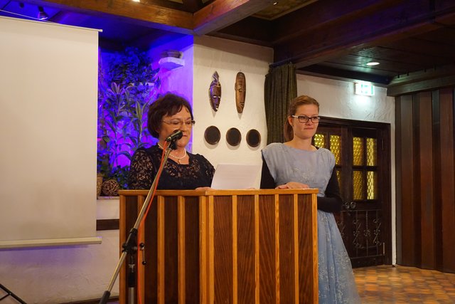 Es folgten nun die Worte und Glückwünsche von Ortsvorsteherin Marika Kramer, welche auch stellvertretend für den Ortschaftsrat und im Namen der Büchenauer Bürger und Bürgerinnen, vorgebracht wurden. Als erstes folgte ein kleiner historischer Abriss in die Zeit des Gründungsjahres 1919 und welche Motivationen wohl die Gründerväter kurz nach dem ersten Weltkrieg hatten, einen Gesangsverein zu gründen. Aus der Literatur ergibt sich, dass ab Mitte des 19. Jahrhundert die Gründung der Gesangsvereine ein Zeichen war, dass Menschen nach Jahrhunderten der Abhängigkeit frei und unabhängig ihre Stimme erheben wollten und endlich auch konnten und darüber hinaus im Singen auch all ihre Sehnsüchte und Wüsche zum Ausdruck bringen konnten. Im Verlauf der weiteren Ansprache führte Marika Kramer an: „Dass Singen an sich gesund ist, Körper und Seele stärkt. Darüber hinaus aber gemeinsam zu singen bedeutet aufeinander zu hören, gemeinsam an einem Ziel zu arbeiten und miteinander einen Wohlklang erreichen zu wollen. Keiner hat hervorzutreten, jeder übernimmt seinen Part, reiht sich ein. Ist dies geschafft, erwächst daraus Freude und Genugtuung.“ Aus den weiteren Worten wurde dann Zunehmens deutlich, wie sehr Marika Kramer schon seit frühester Kindheit mit dem MGV zuerst über ihren Vater, später auch ihren Ehemann und Sohn, verwurzelt ist. Aufmerksam folgten ihr die Zuhörer an den persönlichen Erzählungen und den oft „angedeuteten“ Geschichten, die hier den Rahmen deutlich sprengen würden, so z.B. als sie im Alter von 6 Jahren beim Theaterstück „Vogt auf dem Mühlstein“ mit ansehen musste, wie ihr Vater auf einer Leiter tot aus dem Saal getragen wurde und sie daraufhin heulte wie ein Schlosshund. Dann gab es noch zwei große Überraschungen, als sie ihre beiden originalen Kleider von einem „Ritter-Model“ vorführen ließ. Das erste Kleid von 1959 als sie mit weiteren 19 Festdamen in einem blauen Kleid den Kaiserwalzer beim 40-jährigen Jubiläum tanzte, das zweite von 1969 wo sie ohne von ihrem Vater gefragt zu werden wieder als Festdame beim 50-jährigen Jubiläum verpflichtet wurde, diesmal in einem weißen Kleid. Besonders betont und bedankt wurden auch die vielen musikalisch und kulturellen Veranstaltungen, die immer auf der Höhe der Zeit und einschneidend und wertvoll für alle Bürger und Bürgerinnen Büchenaus waren. Dies gilt auch für die zahlreichen Verdienste des Vereins zur Verschönerung des Ortsbildes.