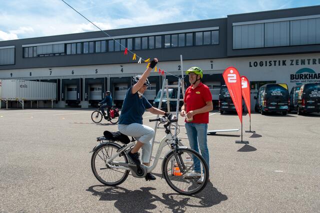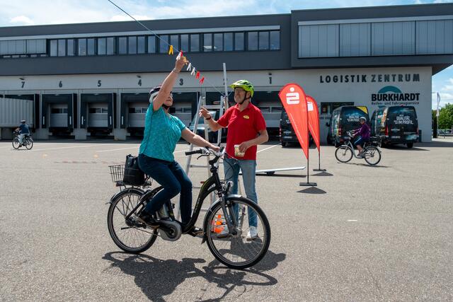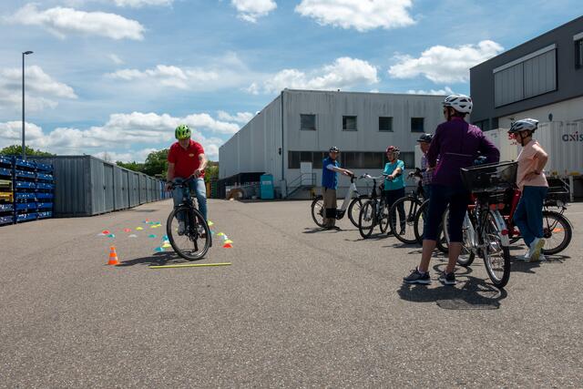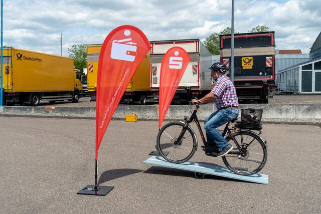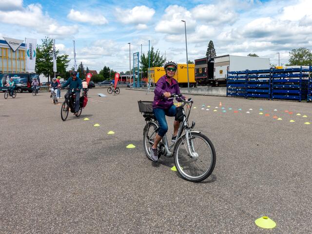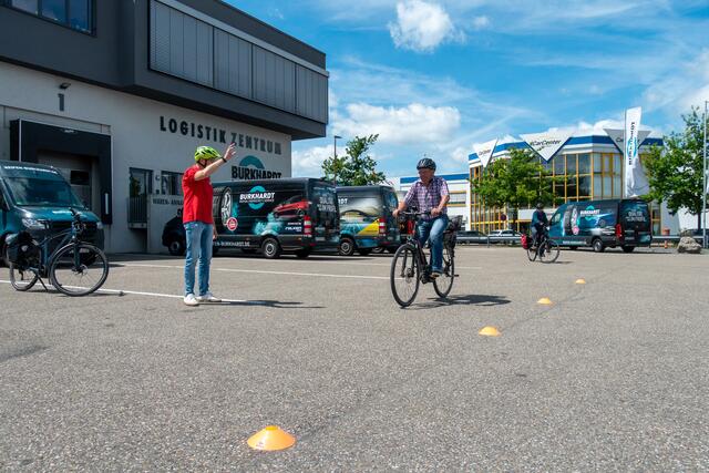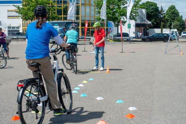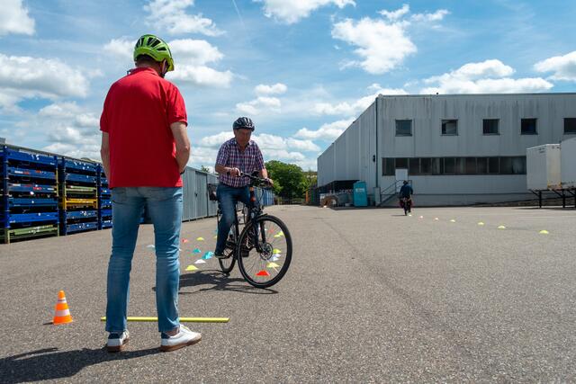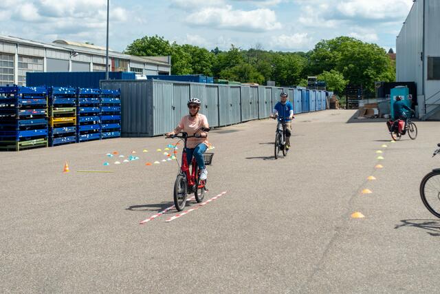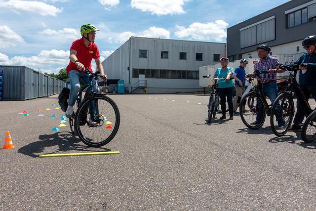 Viel Spaß hatten 7 Teilnehmer beim 3 Fahrsicherheits-Intensivkurs am vergangenen Freitag in Bruchsal. Im ersten, theoretischen Teil gab es eine ganze Reihe Informationen, die für eine Kaufentscheidung wichtig sind. Immerhin geht es bei einem Pedelec oder E-Bike um eine höhere Investition, für die kompetente Fachhändler mit guter Beratung nötig sind. Über weitere Themen, wie technische Sicherheit, Mindestausstattung, Akkulaufzeiten, Antriebsarten, richtiges Bremsen und Schalten, Diebstahlsicherung, Verkehrsregeln und Verhalten in der Gruppe. Nach einer kleinen Stärkung gings dann für praktische Übungen ins Freigelände. Fred Lenz und Gerhard Öfner vom Radsport-Team Kraichgau hatten hierzu eigens einen Parkour aufgebaut, auf dem alle relevanten Situationen unter fachlicher Anleitung geübt wurden. Bei einigen Fahrrädern musste die Sattelhöhe korrigiert werden. Eine korrekte Sattelhöhe schont die Kniegelenke erheblich. Da war zuerst die Erkenntnis, dass der gesamte Parkour zumindest im flachen Gelände, auch mit deaktiviertem Motor gefahren werden kann. Dies sorgte sofort bei allen Teilnehmern für ein sicheres Fahrgefühl beim Slalom, beim Geradeausfahren, Ausweichen, über die Wippe fahren und „Wäsche abhängen“ (Fotos). Im zweiten Durchgang wurde dann die elektrische Unterstützung zugeschaltet. Es war schön zu sehen, wie alle Radler*innen am Ende bedeutend sicherer unterwegs waren. Eine Teilnahme ist durchaus sinnvoll, egal ob eine Anschaffung noch bevorsteht oder man bereits ein Pedelec oder E-Bike besitzt. Es stehen Pedelecs bereit, die uns freundlicherweise der Fachhändler Vit:bikes aus Karlsdorf leigweise zur Verfügung stellt.