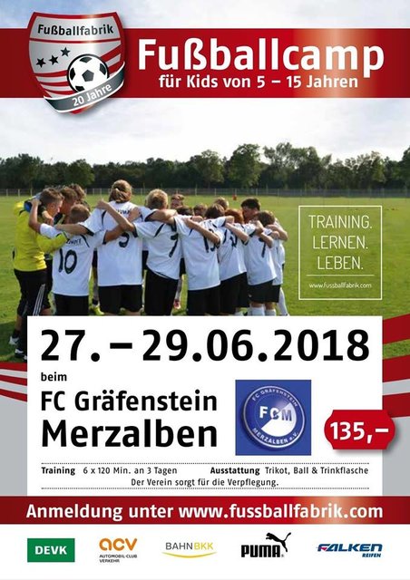 Vom 27.06. bis 29.06.2018 findet das Camp beim FC Gräfenstein Merzalben statt. Alle Nachwuchsspieler sind hierbei gleichermaßen willkommen, egal ob Fußball-anfänger oder schon talentierter Vereinsspieler.
