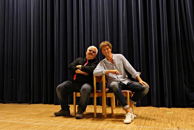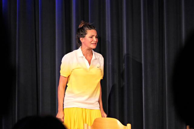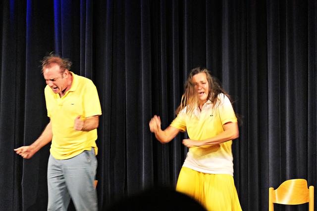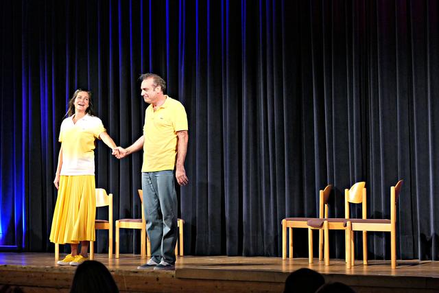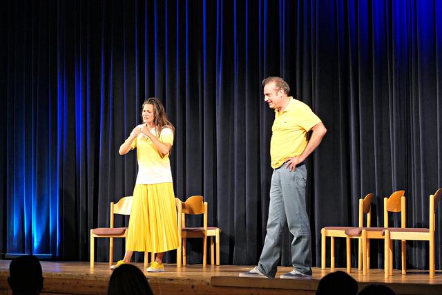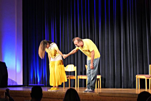 Da die Vorstellung um 17.00 Uhr coronabedingt ausfallen musste, fand die Vorstellung im großen Saal mit gutem Abstand um die Tische um 20.00 Uhr statt. An diesem Abend war die Vorstellung mit ca. 100 Besuchern ausgebucht, denn im normalen Betrieb gehen wesentlich mehr rein. In dieser wundervollen familiären Atmosphäre fühlte man sich gleich recht wohl. Die Bühne war sehr spartanisch nur mit 6 Stühlen bestückt. Schon das Erscheinen von Stefan Beyer mit dem Ruf „Will noch jemand etwas zu trinken?“ erntete Gelächter und nach der Begrüßung kamen die Akteure rechts und links vom Saal entlang zur Bühne, um mit dem Kanon „Froh zu sein bedarf es wenig“ das Publikum sofort mit in das Geschehen einzubeziehen. Dieses „froh sein“ hielt jedoch bei dem Paar nicht lange an, denn es schrie sich sofort an und beharrte auf seiner Behauptung. Den verbalen Schlagabtausch beherrschte das Paar und man merkte den jahrelangen schauspielerischen Hintergrund. Die Situationen, in denen sich die beiden befanden, waren zu komisch. Sie meinte, wenn sie sich zum Beispiel gerade geschminkt hat und er möchte mit ihr unter die Dusche, das ginge dann natürlich gar nicht. Sie beteuerte, er sei der Mann ihres Lebens, aber es fehle halt etwas. Die Komödie glitt nie ab unter die Gürtellinie. Der Schlagabtausch der beiden Akteure saß und begeisterte das Publikum, wenn er zum Beispiel fragte, wer zum Teufel solch ein Buch „Liebesübung – Fit im Schritt ab 45“ vor die Haustür legen würde, antwortete sie „Zeugen Jehovas“. Schallendes Gelächter folgte. Sie lasen abwechselnd die Ratschläge aus dem Buch und spielten es durch, worin angeregt wurde, sich auf dem Küchentisch mit Sprühsahne und Schokostreuseln obendrauf vernaschen zu lassen. Während der ganzen Vorstellung kamen immer wieder Film- oder Musiktitel in den Vordergrund wie „Wenn die Gondeln Trauer tragen“, „Wenn der Postmann dreimal klingelt“, „Das letzte Einhorn“, „Der Spion, der mich liebte“, "Ich sterb an einem andren Tag“, „9 ½ Wochen“, „E.T. nach Haus telefonieren“ und viele mehr. Miguel Abrantes Ostrowski hält nichts von einem Waschbrettbauch und zeigte seinen Waschbärbauch.