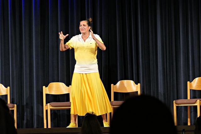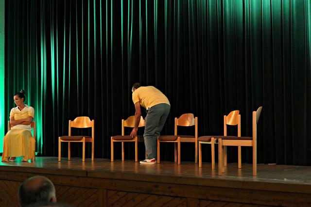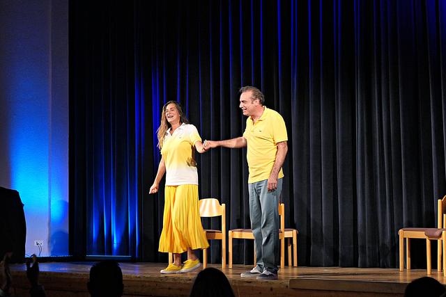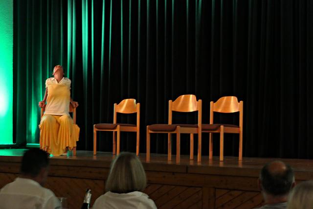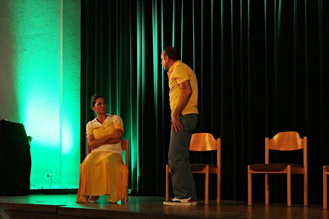 Während der Pause erschien dann auch der Theaterleiter Boris Stijelja, der direkt von einer anderen Aufführung in Maikammer kam, und im Publikum Platz nahm. Die beiden Akteure setzten ihre Querelen fort und Alexandra Kamp verabschiedete sich mit den Worten „Öffnet Eure Herzen! Dies war eine deutsche Erstaufführung, die noch viermal hier im Theater stattfinden wird. Bitte weitersagen, denn nur so kann Theater stattfinden". Und mit einem kräftigen Applaus gingen die beiden Protagonisten von der Bühne.