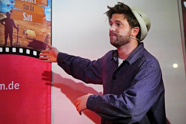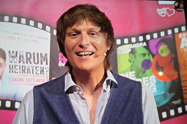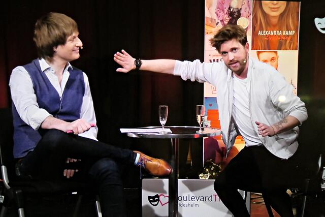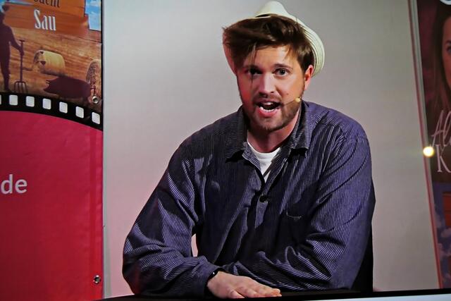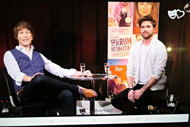 Boris Stijelja führte souverän durch die Sendung. Und natürlich war auch der Winzer Bu Tim Poschmann dabei. Der nahm mal wieder die Veganer auf die Schippe und meinte, die würden nichts für die Umwelt tun, sondern sie essen. Tim hatte einen perfekten Haarschnitt im Gegensatz zu Boris, der dazu auch gleich seinen Senf gab und meinte, er sehe aus wie ein Schlagersänger aus den 70er Jahren. Es folgte ein Auftritt des Klavierkabarettisten Daniel Helfrich, der über „Trennkost“ auf allen Ebenen aus dem Studio B zugeschaltet wurde. Schlagabtausch zwischen Boris und Tim, den beiden langjährigen Freunden, ging in die nächste Runde. Boris sei bereits als 6-Jähriger 1,80 Meter groß gewesen und hatte es im Gegensatz zu dem kleineren Tim schwer, an der Wursttheke ein Stückchen Wurst zu bekommen, weil er nicht dem Niedlichkeitsschema entsprach. Tim hätte nie gedacht, dass er einmal in der Pfalz die Touristen und die Heidelberger vermissen würde. Aufgrund seiner tausende Mal angeklickten Winzer-Bu-Videos im Internet und der Reichweite über mittlerweile ganz Deutschland und Frankreich, hat er nun ab November seine eigene Show „Ja, wu sinn se dann?“ bekommen und alle Shows sind restlos ausverkauft. Er erzählte, dass er nie gedient habe, sondern lieber Zivildienst leistete. Er wollte lieber Essen auf Rädern verteilen als die Waffe in der Hand zu halten. Dies war der passende Übergang zum nächsten Comedian, dem Ausbilder Schmidt. Dieser erwähnte auch gleich, dass es massive Nachwuchsprobleme bei der Bundeswehr gebe. Er erzählte von seinem Saunabesuch. Immer wieder zwischendurch schaltete Boris zu seinem Facebook-Account und stellte fest, dass die Boulevardtheater-Fans auf der Couch vor dem Bildschirm gemütlich vor ihrer Schorle mit Chips saßen. Er erklärte, dass er immer wieder gefragt würde, ob die Geschichten, die er so erzählen würde, alle wahr seien. Und er bejahte, dass dies zu 90 % zutreffe.