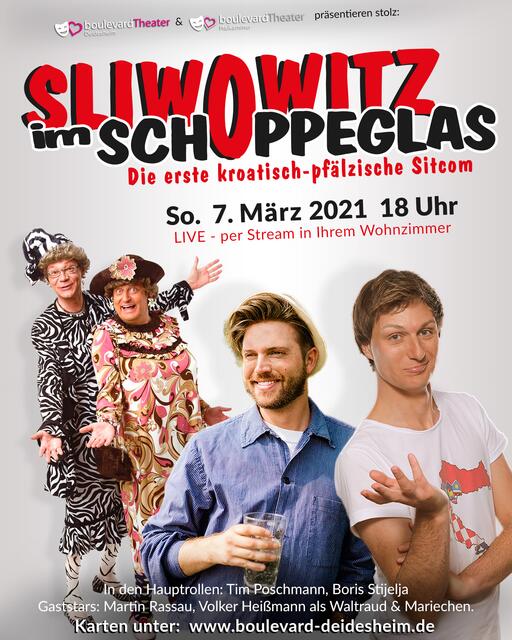 Nur 2 Tage später, am 9. Februar gab es eine Pressekonferenz via Homepage Boulevardtheater Deidesheim, indem sie live über das Projekt „Sliwowitz im Schoppeglas“ – der ersten pfälzisch kroatischen Sitcom - berichteten. Die Fans konnten über Facebook Fragen stellen, die Sabine Helfrich von der Öffentlichkeitsarbeit an Boris Stijelja, Tim Poschmann und Tobias Schollinger weitergab.