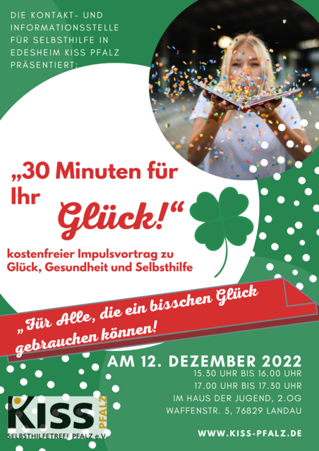 „30 Minuten für Ihr Glück“ – kostenfreier Impulsvortrag zu Glück, Gesundheit und Selbsthilfe am 12. Dezember, 15.30 Uhr bis 16 Uhr sowie 17 Uhr bis 17.30 Uhr, Haus der Jugend, Waffenstraße 5, 76829 Landau. ps