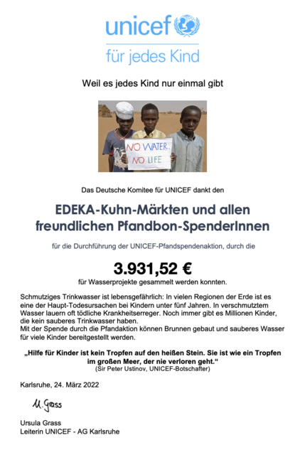 Gleich mit drei EDEKA-Märkten beteiligte sich Inhaber Manuel Kuhn an der Pfandspendenaktion zugunsten von UNICEF-Wasserprojekten. Besonders ansprechend ist die Gestaltung der Flaschenrückgabestationen in seinen EDEKA Märkten in Eggenstein-Leopoldshafen und Linkenheim nachdem tragischerweise vor zwei Jahren Plexiglasspendenboxen gefüllt mit Bons für einen guten Zweck gestohlen worden waren. Nicht nur sicher sondern auch optisch bestechend sind seitdem die Stationen ausgestattet und die Kunden brauchen nur noch ihren Pfandbon eintippen.