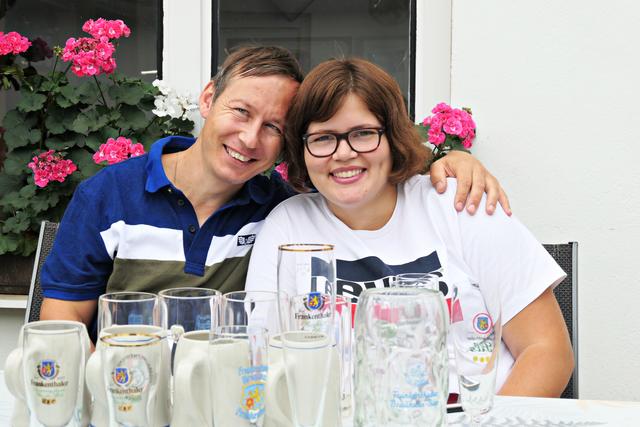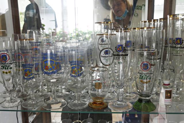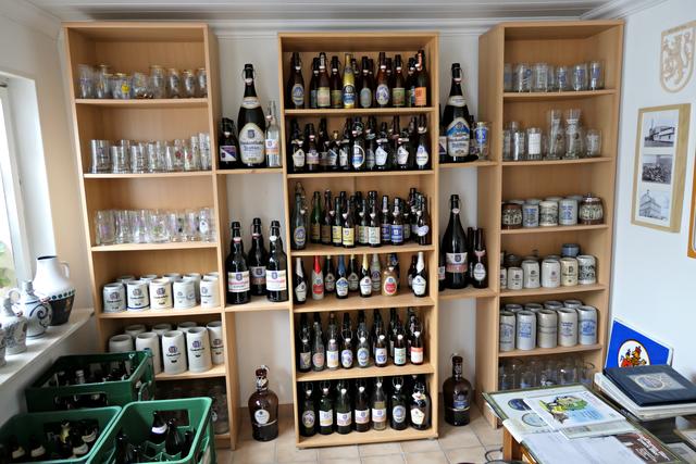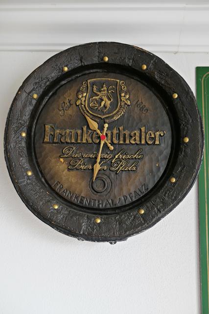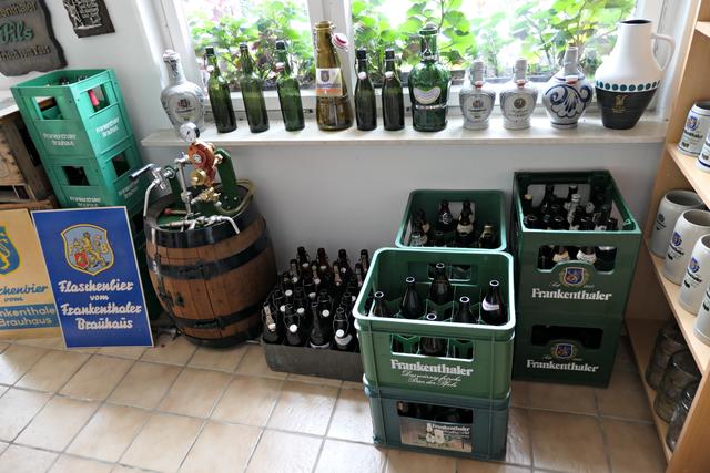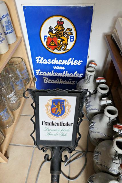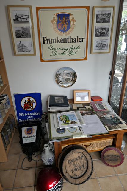 Szepanski hat dieses Häuschen mit ca. 10 Quadratmetern seit 2014. Ein Kleinod, wenn man bedenkt, dass hier drin ehemals ein richtiger Schweinstall beheimatet war. Das kleine Gebäude stand leer bevor es von der Familie Szepanski renoviert und mit wenigen Stücken der Frankenthaler Bierbrauerei bestückt wurde. 2015 war man damit fertig und es sprach sich schnell herum, das es hier ein kleines, aber feines Biermuseum mit Frankenthaler Bierexponaten gebe. Seitdem bringen immer wieder Leute etwas vorbei, um seine Sammlung zu erweitern, worüber er sich jedes Mal riesig freut. Er hat einige Exponate, an denen sein Sammlerherz besonders hängt, unter anderem ein 5-Liter-und ein 3-Liter-Keramikkrug mit Brauereiansicht, außerdem ganz alte Krüge, einer aus dem Jahre 1900, dessen Schriftzug in den Ton geschnitzt wurde, und einer von 1920 mit eingraviertem Schriftzug. Aus dem Jahre 1909 hat er einen kleinen Krug 4/10 Liter, der mit dem Logo von Villeroy & Boch gestempelt ist. Zwei grüne Flaschen beförderte er auch noch aus dem Schatzkämmerlein, nämlich eine aus dem Jahr 1889 mit Bügelverschluss und eine von 1900 mit Kronkorken (die besonderen Stücke hab ich fotografiert).