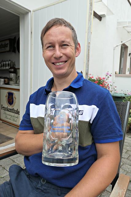 Ich kam natürlich nicht ohne etwas in den Händen, sondern brachte ihm einen 0,1 Liter Bierglas mit Noppen und dem Frankenthaler Wappen mit. Was mich besonders freute war, dass ihm ausgerechnet dieser Krug in seiner Sammlung fehlte. Und so strahlte er die ganze Zeit über wie ein Honigkuchenpferd. Nun hat er augenscheinlich 5 gleiche Gläser, jedoch alle mit kleinen Unterschieden wie er mir erklärte. Paul sieht alles! Zur Feier des Tages baute er mit ein paar Handgriffen sogar eine Bar auf, natürlich mit dem Schriftzug von Frankenthal.