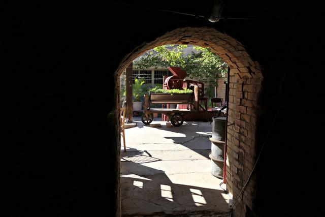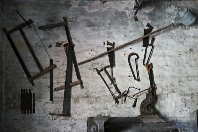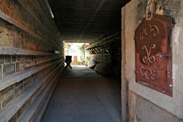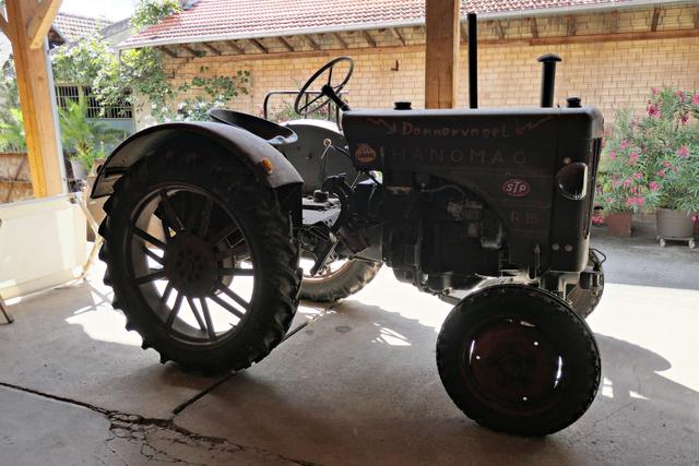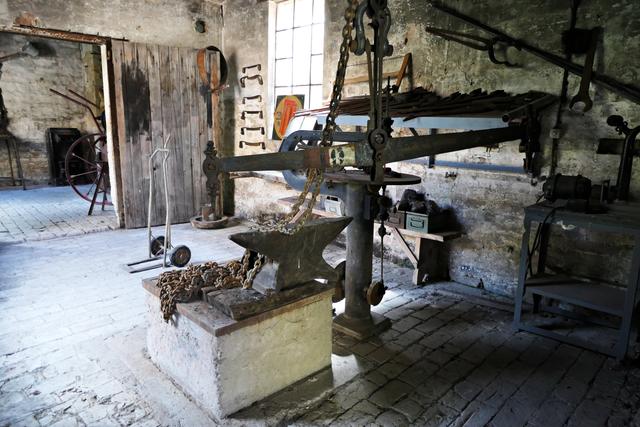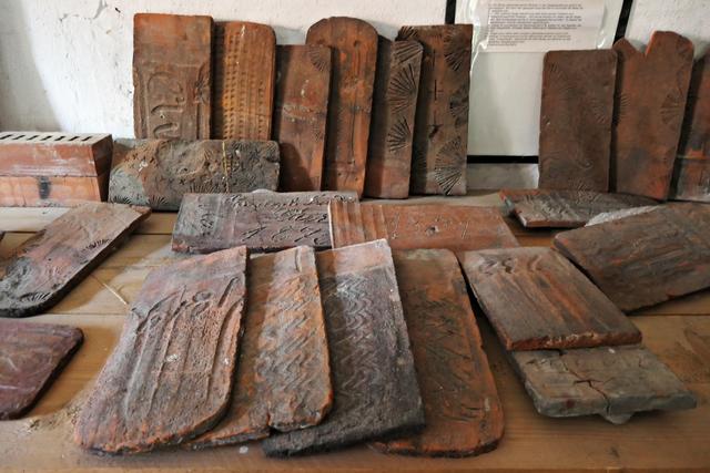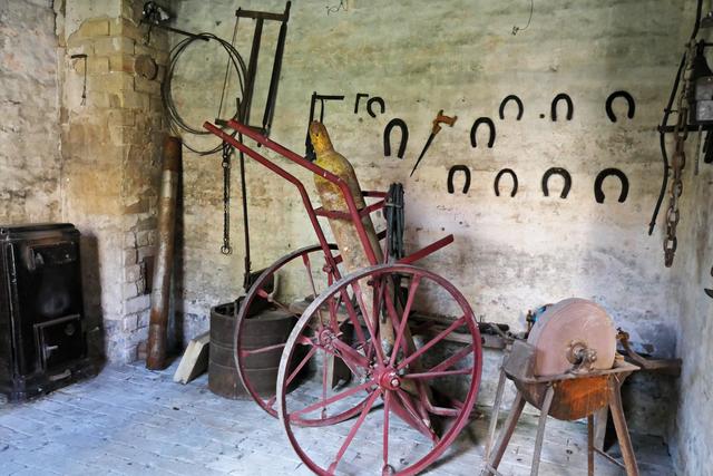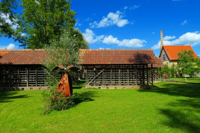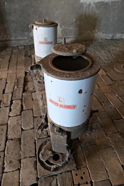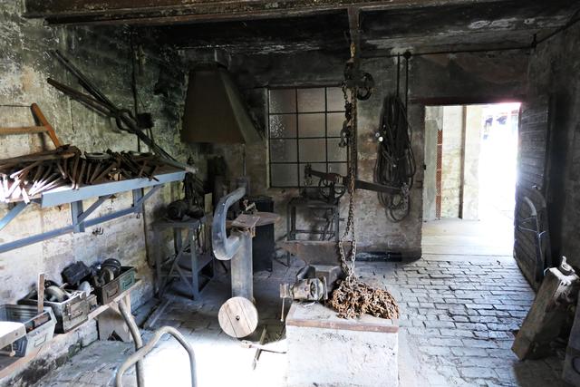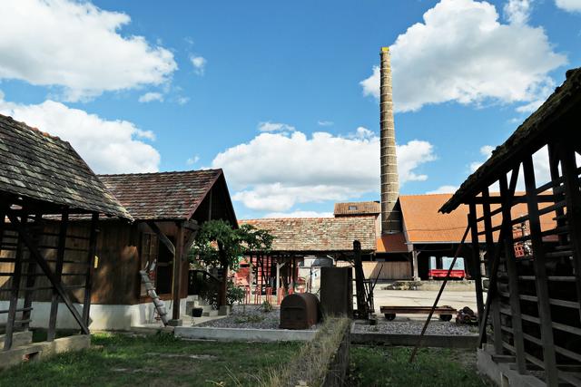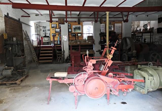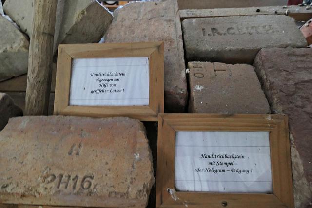 Danach wurden wir in die erste Räumlichkeit geführt. Hier wird eine Ausstellung zum Wiederaufbau dieser Ziegelhütte gezeigt in Form von etlichen historischen Fotos, allerlei Ziegelei und technischem Werkzeug als die Ziegelei noch im Betrieb war. Ein Teil der Bilder zeigt, in welchem Zustand dieses Areal von Familie Haag vom Land übernommen und dann im historischen Stil wieder aufgebaut wurde. Besonders sehenswert sind die ausgedienten Trocknungshütten, in denen die Ziegel vor dem Brand in der ursprünglichen Form an der Luft getrocknet wurden. Das Material, das hier abgebaut wurde, war sehr sauber und wenig eisenhaltig. Man kann hier sehen, was das für eine harte Arbeit war, wie oft die Steine in die Hand genommen werden mussten bis sie fertig zum Gebrauch waren. Der historische Ablauf der Ziegelproduktion begann mit der dampfbetriebenen Strangpresse, in der der in der Region abgebaute Lehm gegebenenfalls mit Sand und anderen Zusatzstoffen vermischt und zu den feuchten Ziegeln verarbeitet wurde. Für Reparaturen hatte die Ziegelei eine eigene vollständig erhaltene Schmiede, die im gegenüberliegenden Gebäude untergebracht war.